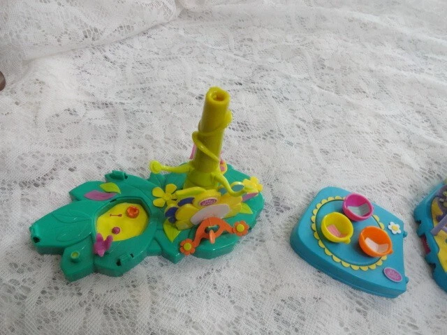 2002 Polly Pocket Playsets- Amusement Park, Carousel, Butterfly Ride, Flower Fairies Flying School Motorized rides on amusement park playset for ferris wheel and tea cup ride- uses 2 "C" batteries, working, clean battery compartment. Missing loop for aerial ride. Flower Fairies Flying School missing pieces.