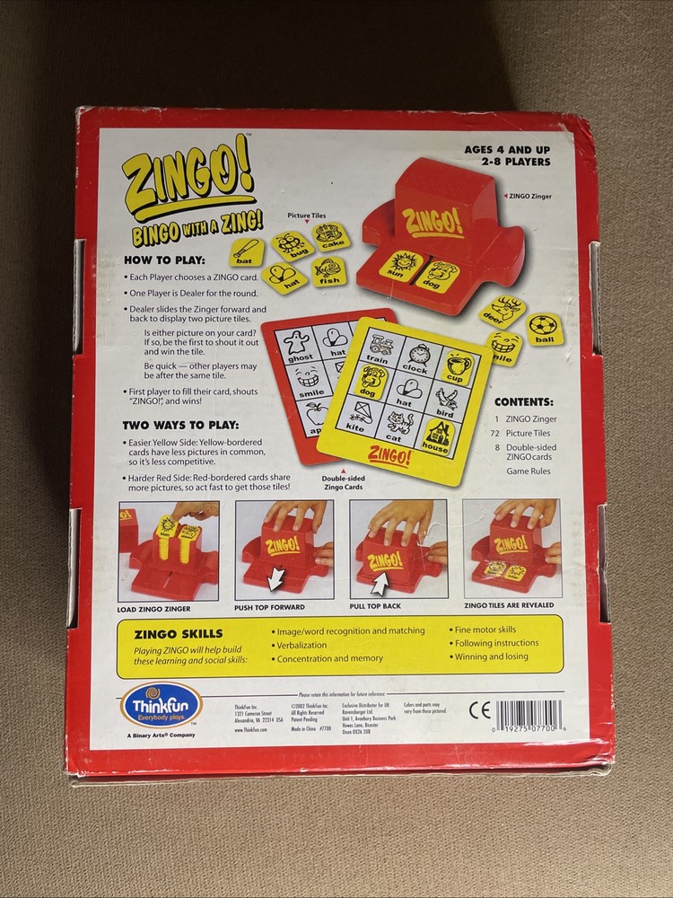 The ThinkFun Zingo! Bingo game is a fun learning activity for kids aged 4 and up. This first edition from 2002 features picture tiles and cards in red and yellow colors. The plastic game set includes various subjects to engage young learners and is suitable for ages 4 to 16. Made in China, this game provides an interactive and educational experience for children.