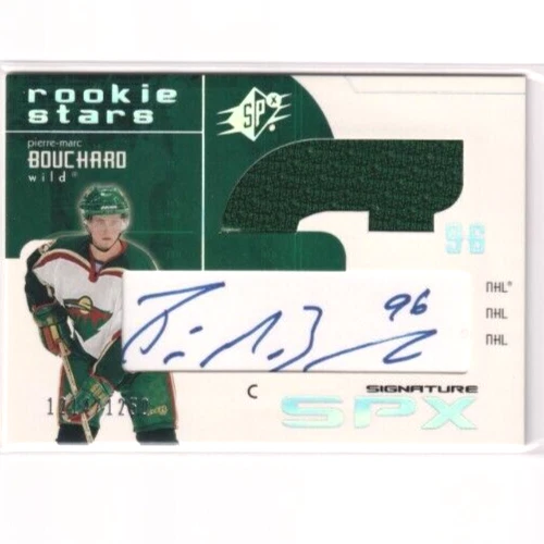 2002-03 UD SPX Rookie Stars Jersey AUTO Pierre Marc Bouchard /1250 Wild You are buying the above listed card only. Cards shipped in a penny sleeve, top loader, and team bag in a white envelope, higher end and lots of 4 or more shipped in a bubble envelope. Over 10 000 Young Guns in stock TeamChevelle Collector Cards on Facebook and Instagram @teamchevelle on Twitter Check out my other cards on eBay under seller name teamchevelle