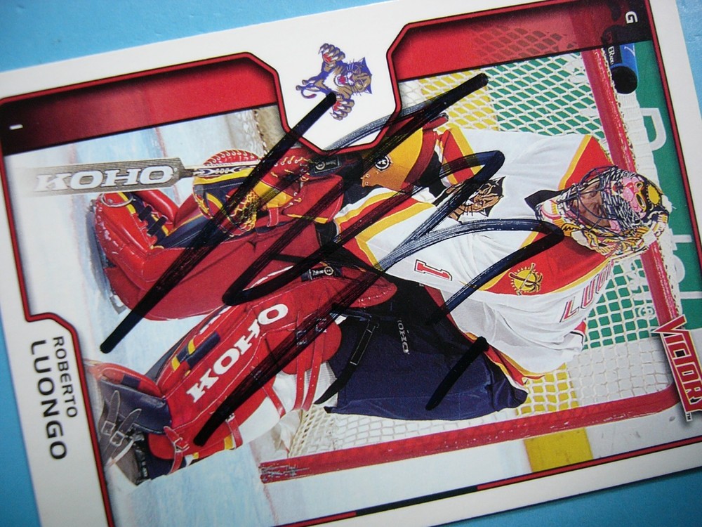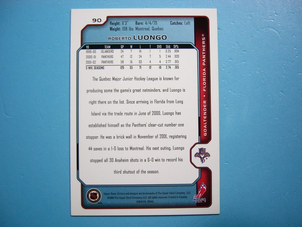 YOU ARE BIDDING ON A 2002/03 UPPER DECK VICTORY NHL HOCKEY CARD #90 ROBERTO LUONGO, FLORIDA PANTHERS . A VERY SHARP NEAR MINT RANGE CONDITION CARD THAT ON FRONT SHOWS A 100% ORIGINAL & AUTHENTIC AUTOGRAPH OF PLAYER NOTED ABOVE . CORNERS ARE SHARP. ABSOLUTELY NO CREASES, BENDS OR WRINKLES. SEE SCANS FOR FURTHER IDEA OF CONDITION & CLOSER VIEW OF PLAYER SIGNATURE. GREAT COLOUR & GLOSS--A VERY SHARP, CLEAN & ATTRACTIVE VERY POPULAR AUTOGRAPHED CARD FROM THIS VALUABLE UPPER DECK NHL HOCKEY SET!!! THANKS FOR LOOKING AND GOOD LUCK!!! ------------------------------------------------------------------------------------------------------------------------------------------------------- SHIPPING WITHIN CANADA IS $3.50, TO THE UNITED STATES $4.00, AND INTERNATIONALLY $7.00 (EVERYWHERE ELSE). ITEM WILL BE CAREFULLY PACKAGED SO AS NOT TO GET DAMAGED DURING SHIPPING. IF YOU WOULD LIKE INSURANCE OR ANOTHER SHIPPING METHOD, THAT IS FINE SO LONG AS YOU COVER ANY OVERAGE IN COST. I DO COMBINE SHIPPING ON MULTIPLE PURCHASES--ONLY 20 CENTS MORE PER ADDITIONAL SINGLE PHOTO OR CARD. TAKE A LOOK AT MY OTHER AUCTIONS AND SAVE ON SHIPPING!!!