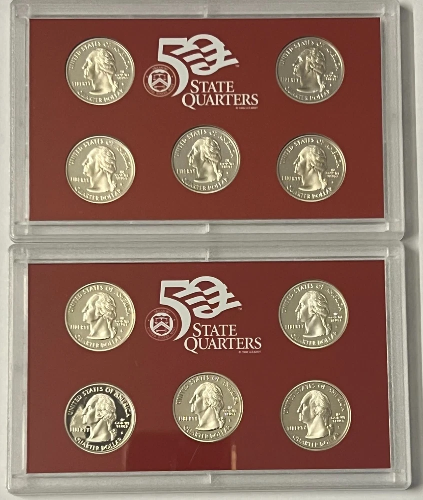 UP FOR SALE IS A SET OF 2 SILVER QUARTER PROOF SETS WITHOUT BOX OR COA. THESE SILVER QUARTER PROOF SETS ARE FROM YEARS 2003 AND 2005. IN OTHER WORDS YOU WILL GET 10 SILVER PROOF COINS. I AM SELLING SEVERAL LOTS SO BUY AS MANY AS YOU LIKE. THE PHOTOS SHOW ONE OF THE ACTUAL LOT. THESE SETS DO NOT HAVE THE ORIGINAL PACKING OR COA. YOU WILL GET THE COINS IN PLATIC CASES AS SHOWN IN THE PHOTOS. LOOK AT MY GREAT FEEDBACK AND BUY WITH CONFIDENCE. BUY ON AS MANY AS YOU WANT. FEEL FREE TO SEND ME A MESSAGE IF YOU HAVE ANY QUESTION. HAPPY BIDDING, GOOD LUCK AND ENJOY YOUR COIN. I WILL COMBINE SHIPPING. Satisfaction Guarantee Please read the description carefully, check out the photos, and ask questions prior to bidding to avoid misunderstandings. I will refund 100% of the price you paid including shipping if I misrepresented the item or sent a different item other then mentioned in the listing. We guarantee this lot to be authentic and as described (see our feedback rating and years of glowing reviews to confirm our status as a trustworthy seller). Shipping We ONLY ship with in USA to your VERIFIED PAYPAL ADDRESS. Please do not ask us to ship to a different address because we cannot do it. Guaranteed Quick Shipping! Normally orders are shipped SAME DAY of payment unless we have an unusually heavy order load (we are closed Saturday and Sunday). We ship via USPS First Class Mail, Priority Mail or sometimes FedEx Ground, depending on weight and the type of item being shipped. Returns We want you to be happy with your purchase. I will refund 100% of the price you paid including shipping if I misrepresented the item or sent a different item other then mentioned in the listing. Payment Please make payment within 3 days of invoice. We ONLY accept PayPal for payment. We do not accept any other form of payment when making your purchase on eBay. 5 Star Feedback Please post 5 STAR feedback after the transaction is completed. If for any reason you do not feel you received 5 star service, please contact us so we can try and resolve the issue and achieve the 5 star standard which we strive for. Positive feedback is reciprocated. I ONLY SELL AUTHENTIC COINS.