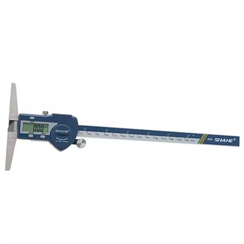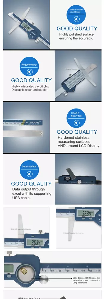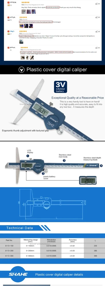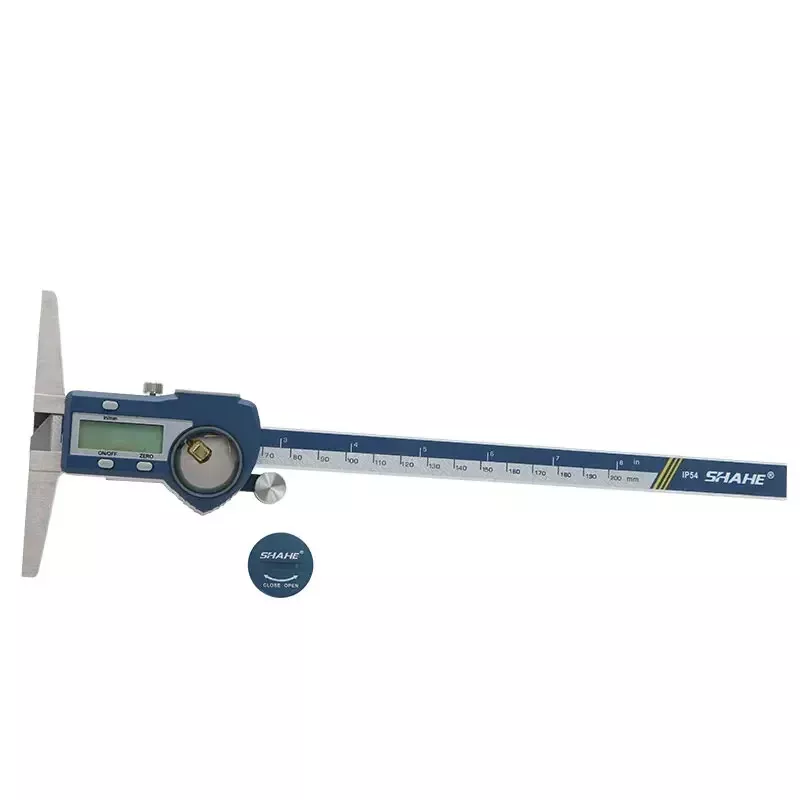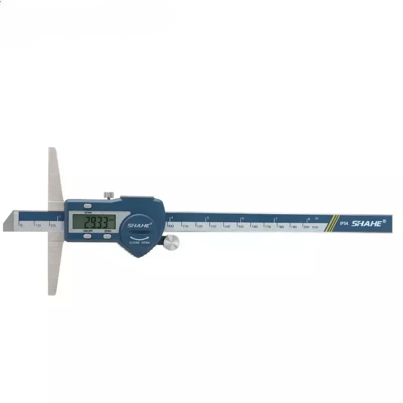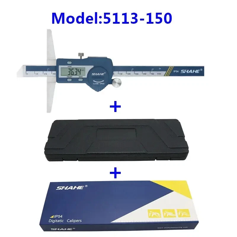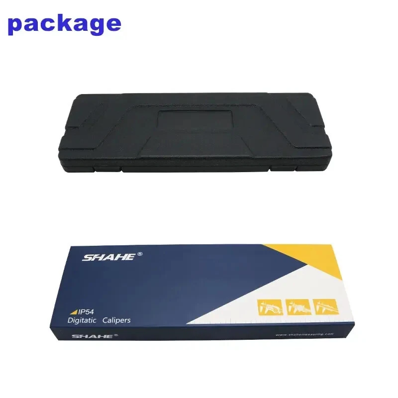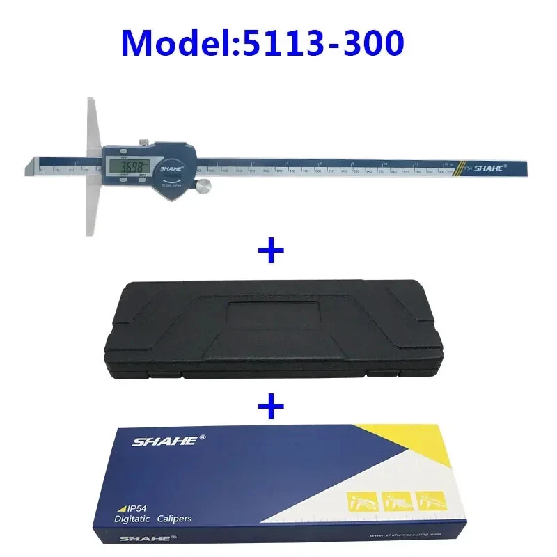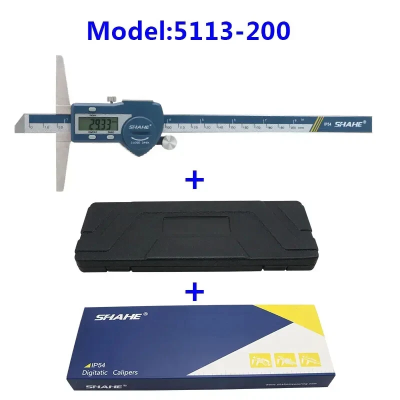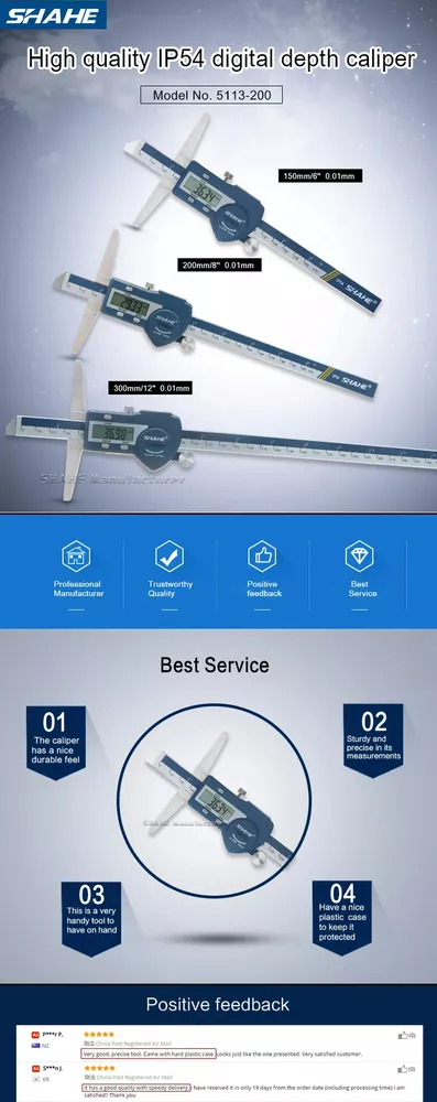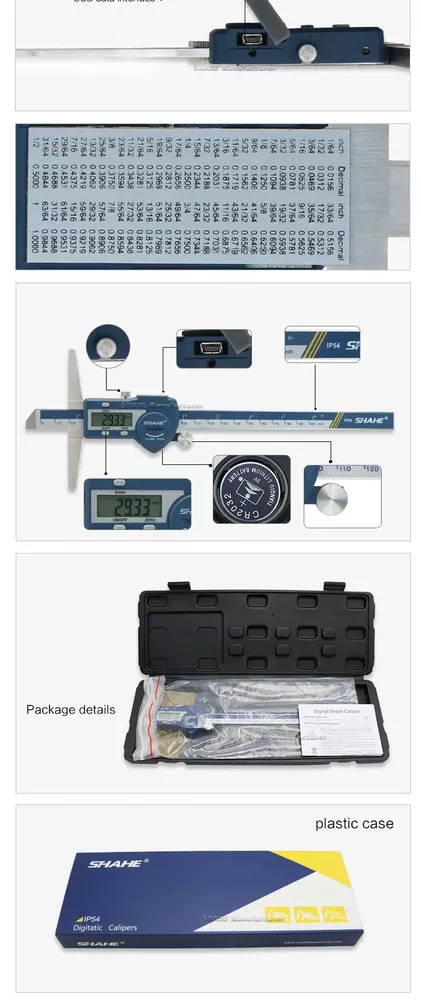 Note: The product will be sent without battery from China ,battery type is one piece 3V CR 2032 environmental Lithium battery 1.Hardened stainless steel main scale and measuring jaws 2.knurled locking screw for more convenient measurement and reading 3.Higher quality glass fixed grid, stable, durable and high accuracy 4.Quick display of the measured value on LCD screen, no over-speed error 5.With data output function (must buy SHAHE Data output device) 6.With on-off power button, automatic power off, waterproof IP54 7.Zero-setting at any position, mm/inch measurement system conversion 8.Convenient and direct precision measurement for measure the depth of narrow grooves and holes Model:5113-150 Measuring range:0-150mm Resolution:0.01mm/0.0005inch Accuracy:±0.02mm Model:5113-200 Measuring range:0-200mm Resolution:0.01mm/0.0005inch Accuracy:±0.03mm Model:5113-300 Measuring range:0-300mm Resolution:0.01mm/0.0005inch Accuracy:±0.04mm Type:SHAHE Digital Depth Caliper 5113 Capacitive grid transducer:Glass fixed grid Material:Stainless Steel Protection :IP54 Display :LCD Battery:3V CR2032 (not included) Function:Auto-Off,Zero-set,Inch/mm conversion,Data output ①Digital caliper *1 ②Caliper English manual *1 ③Sturdy package box *1+paper box *1 ④Mini screw for open battery cover*1