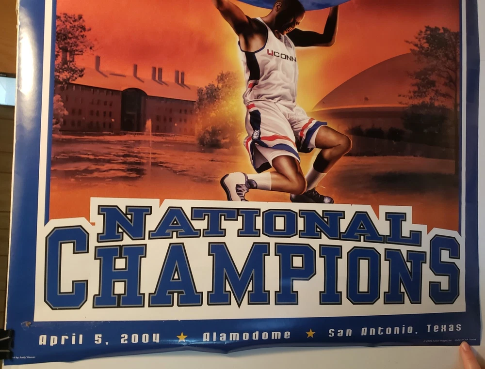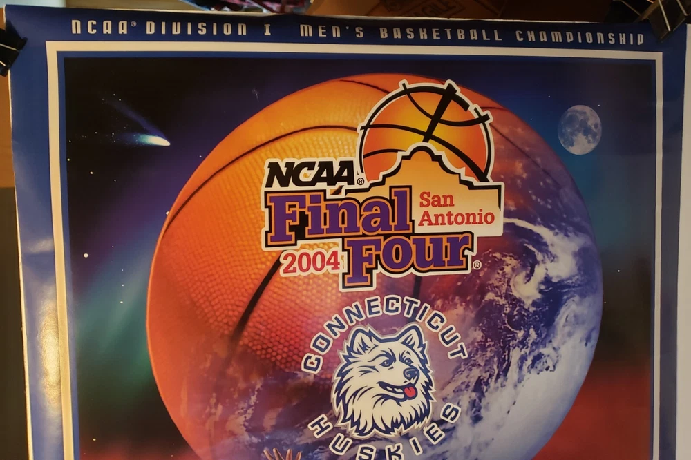 This is a 2004 Connecticut Huskies Final Four NCAA Men's Basketball 24 x 36" (approx.) Poster . Never displayed, but has heavy roll bend lines, stress crease lines running down poster , poster will ship in a sturdy tube, tubes take longer for USPS to deliver usually around 3 weeks, I ship next day . Please see photos for condition. I have other items in my E-Bay store if you are interested. Please see above for shipping and handling. E-mail me with any questions. Thank You!!!
