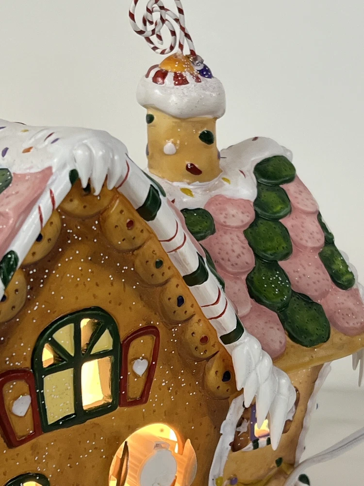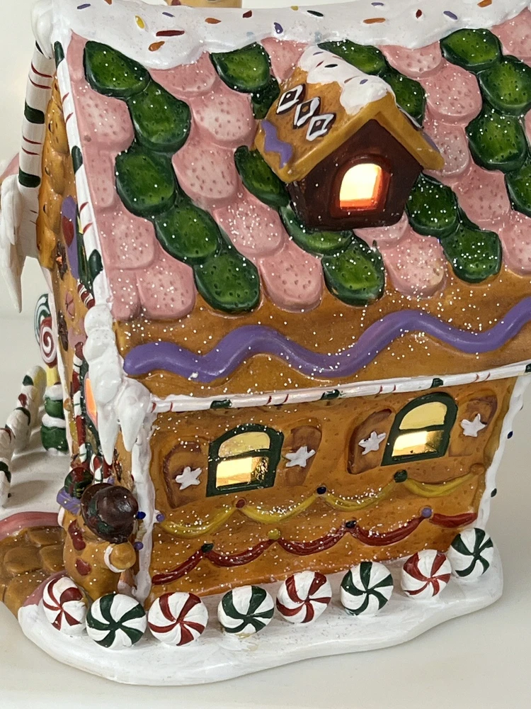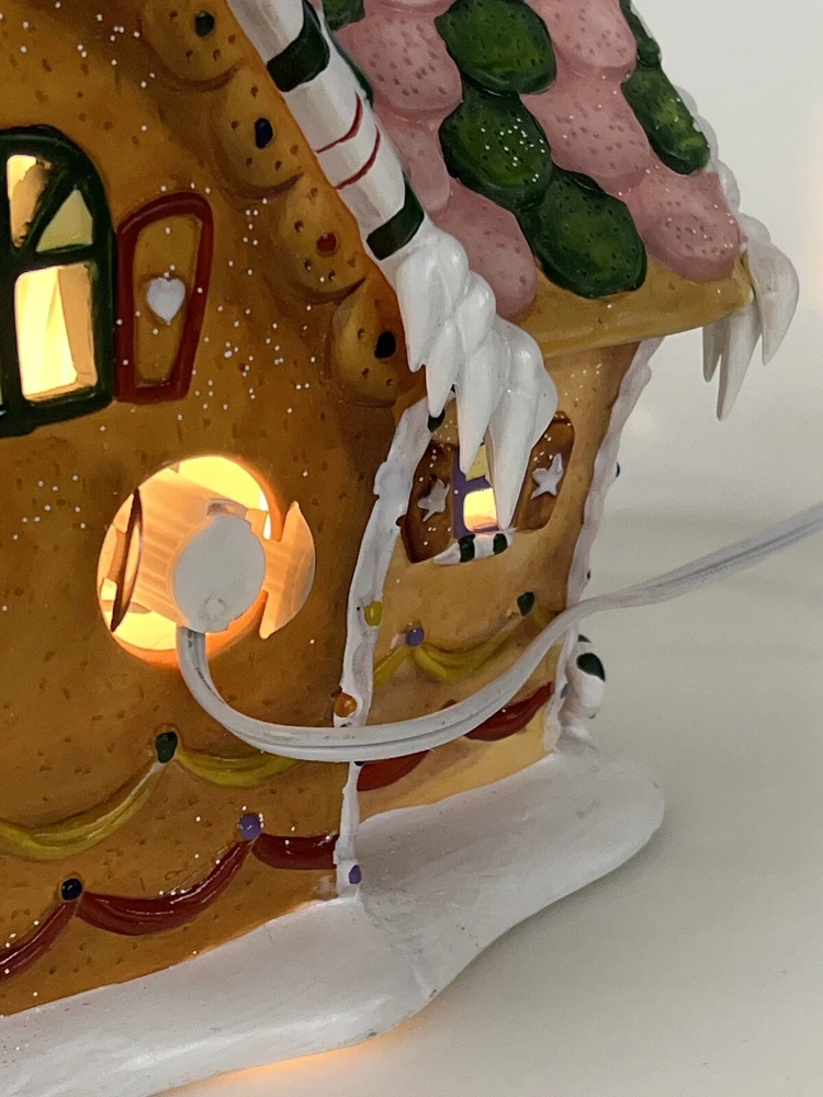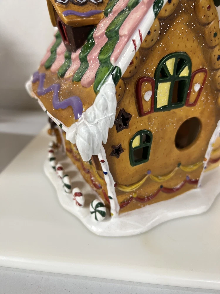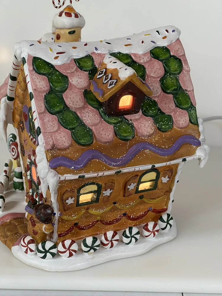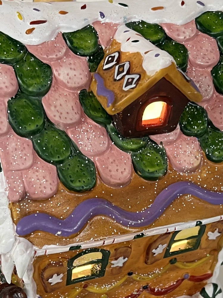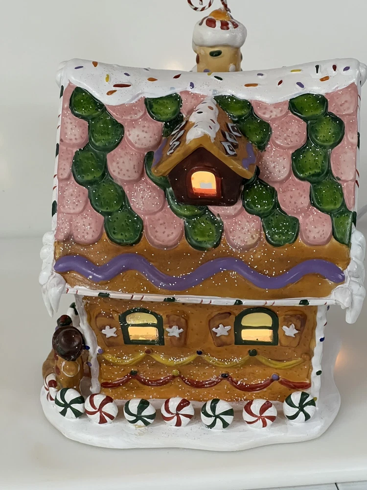 Holiday Time 2004 Village Collectibles Gingerbread House is a Medium-sized, hand-painted porcelain Christmas village piece. With a whimsical, Traditional style, it features an Asymmetrical shape with a 3D effect. This Limited Edition, Retired item is illuminated and has a textured finish, suitable for every day or seasonal display. Standing at 9 inches tall, it showcases a colorful, Multicolor design of a Gingerbread character. Perfect for any room, this collectible piece captures the festive Christmas theme. Beautiful piece , small repair on “ icicles “ on back corner of building, hard to see , picture # 3 . No original box , comes with light & cord Very good condition, very rare