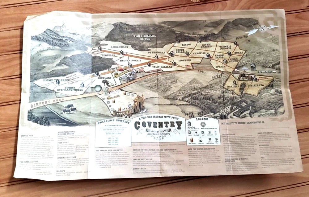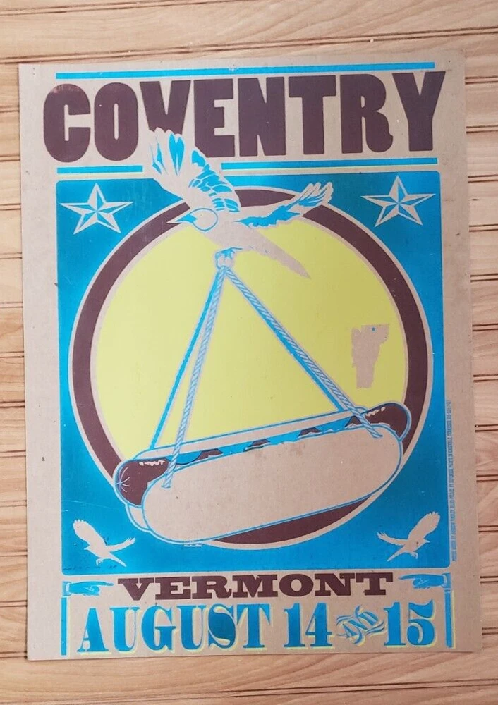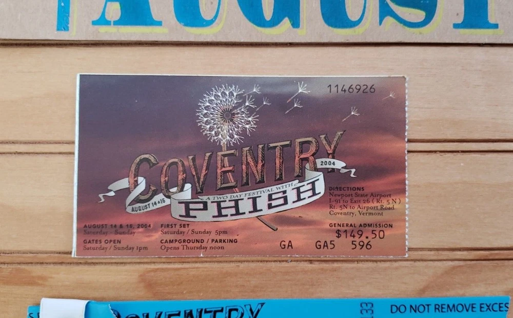 I have this rare poster of Coventry Festival in Vermont 8-14/15-2004. It is a Andrew Findley work. It comes with a wristband, mail order ticket stub and a festival map Saddest final "Curtain"...this festival was just hard for everyone on so many levels. The mud was fn crazy...lost shoes. Last shows...forever for all we knew. Trying to find your car along some random road after. SET 1 : Walls of the Cave > Runaway Jim -> Gotta Jibboo , You Enjoy Myself > Sample in a Jar > Axilla > Poor Heart > Run Like an Antelope [1] , Fire SET 2 : AC/DC Bag -> 46 Days > Halley's Comet -> Ya Mar , David Bowie , Character Zero SET 3 : Twist -> The Wedge , Stash > Free , Guyute , Drowned > Friday ENCORE : Harry Hood [2] [1] Tom Marshall on vocals. [2] With Trey banter. At the end of Hood, the band stopped playing allowing the audience to sing the "You can feel good, good, good about Hood" refrain. This was the first show of the Coventry festival and was simulcast in movie theaters nationwide. During YEM, the band gave away their trampolines. Throughout the duration of the set, groups of fans held the trampolines above their heads, and some fans jumped on the trampolines as well. Tom Marshall sang the lyrics to Antelope. Trey teased Waves in Halley's Comet. Before Bowie, Trey told a story of the summer he spent living in a cabin in the Northeast Kingdom where he remembered writing several songs, including Bowie. Trey explained that Bowie was an attempt to see “how far can you push it in the harmonic and rhythmic language and still have people dancing.” During Hood, Trey (speaking in rhythm) noted that because there were a row of rocks separating the band from the crowd, they were feeling a certain level of disconnect (particularly when Mike plays a "sexy" note). To remedy the situation, Trey and Mike ventured down onto the rocks for the duration of the song. At the end of Hood, the band stopped playing, allowing the audience to sing the “You can feel good, good, good about Hood” refrain. SET 1 : Mike's Song > I Am Hydrogen > Weekapaug Groove , Anything But Me , Reba , Carini > Chalk Dust Torture -> Possum > Wolfman's Brother [1] > Taste SET 2 : Down with Disease [2] > Wading in the Velvet Sea [3] , Glide , Split Open and Melt -> Ghost SET 3 : Fast Enough for You , Seven Below [4] -> Simple > Piper -> Cool Jerk [5] -> The Dickie Scotland Song [6] , Wilson > Slave to the Traffic Light ENCORE : The Curtain With [7] [1] Explanation from Trey as to the history of the song; also features Trey's mom, Mike's mom and John Paluska on "sexy bump". [2] Unfinished. [3] Page and Trey break down. [4] "Seven Below" shouted by all band members sporadically during the jam. [5] Phish debut; lyrics changed to honor Mark "Bruno" Bradley. [6] Debut; lyrics referenced Hadden Hipsley and Dickie Scotland [7] Jam segment stopped and restarted in correct key. This was the second show of the Coventry festival and was the presumed “Final Show.” When Trey made his “break-up” announcement the preceding May, he indicated that Coventry would be the final Phish shows. In reality, this turned out to be the final public show for over four and a half years. This show was simulcast in movie theaters nationwide. Before Anything But Me, Trey announced that, for the first time in 21 years, he was nervous performing a Phish show. During Wolfman’s, Trey revealed that the Wolfman’s Brother is, in fact, Fish (as well as the fact that he handed the phone to his friend Liz Durfee). Also, during Wolfman’s, Trey and Mike invited their mothers onstage (and later John Paluska) to do the “sexy bump” dance. Disease was unfinished and featured Trey briefly playing his guitar with a glow stick. Both Page and Trey broke down during an especially emotional Velvet Sea. After a thoroughly botched Glide, all four band members offered words of thanks to the fans for their continued support and dedication and brief reflections on their twenty years together. Trey then stated that what they really needed to do was “blow off some fucking steam” before starting up Melt. There was an enormous glow stick war during Ghost featuring hundreds, if not thousands, of orange glow sticks. This version of Seven Below saw all of the band members sporadically shouting “Seven Below” throughout the jam. The Phish debut of Cool Jerk contained alternate lyrics honoring monitor mixer, Mark “Bruno” Bradley. The Dickie Scotland Song was spontaneously created and included lyrics in honor of production manager, Hadden Hipsley, and tour accountant, Richard Glasgow (a.k.a. Dickie Scotland). Before Wilson, Trey asked the crowd to sing to another of their friends “for the last time.” There was a fireworks display between the end of the third set and the encore. Before the encore, while explaining the origins of The Curtain, Trey jokingly announced that the entire Chicago Symphony and the Twyla Tharp Dance Troupe were going to perform Gamehendge. Trey explained that they chose The Curtain With as the last song to bring them full circle, because, not only was it one of the first Phish songs he wrote, but he wrote it in a cabin one town over from Coventry. Trey stopped and restarted the jam segment of the Curtain With, because they were in the wrong key or, as he explained, ”Since we are going to be bringing ourselves back in time, we may as well do it in the correct key.” There was no P.A. music after the