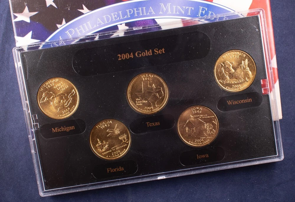 2004 State Quarter Collection P/D Platinum and Gold Editions Lot of 4 25c 2004 State Quarter Collection P/D Platinum and Gold Editions Lot of 4 25c 20 Quarters total See photos to further evaluate condition . About HCC Rare Coins Howard C. Cook, Jr, founded HCC in 1991, and ever since our company has prided itself in being a rare coin management company that offers customers the deep experience our staff of professionals has to offer. HCC Inc. is the only company that offers free written coin and currency appraisals to bank customers and the community at large inside banking offices throughout Indiana, Illinois, Kentucky, Michigan, New York, Ohio, Pennsylvania, and West Virginia. These appraisals are where we purchase many of the great collector coins we have for auction here on eBay. HCC Rare Coins is a member of the American Numismatic Association, Professional Numismatists Guild (Howard C. Cook PNG member), PCGS, NGC and CAC grading services, as well as a member of the Better Business Bureau with an A+ rating and the Toledo Regional Chamber of Commerce. When you do business with HCC you are dealing with professionals. It is our goal to make sure that our customers are satisfied. Providing exceptional customer service is at the top of our list. We hope that you to enjoy doing business with us and come back again and again. Payment Items must be paid within 7 business days of an auction or buy-it-now’s close. eBay payments. We also accept Master Card, Visa, Discover & American Express by phone. Call our office toll free at 1-800-422-4405 to pay by credit card between 9:00 a.m. and 5:00 p.m. (eastern time) Monday through Friday – we are closed on Saturday and Sunday. Send payment to P.O. Box 790, Maumee, OH 43537 Shipping ( Domestic (U.S.) Only) We ship fully insured through USPS. Items less than 16 oz. will ship via First Class Mail and anything 16 oz. or over will ship via Priority Mail. Both methods will provide a tracking number, most high value items with come with signature tracking (over $350). Items are shipped Monday through Friday, within 1 business day from the date the payment clears. Combined Shipping A Combined Shipping Discount is offered for any additional items won within a one week period. Customers will be charged an additional 50¢ per item to the highest shipping price listed (Example - you purchase several small single coins that are at the rate of $4.50 each and a larger/more expensive item at $10.50 - you'll be charged the $10.50 + .50 cents for each additonal item). Please wait for an adjusted invoice BEFORE sending your payment to take advantage of this great offer. Return Policy We want you to be 100% satisfied with your purchase. For that reason, you may return any item for a full refund, less shipping and handling, within 14 days from receipt (P.O. Box 790, Maumee, OH 43537). Please contact us to let us know you will be returning the coin. A 10% restocking fee may be charged for certain returns in which we have incurred a loss, ( unless we have made an error or the item is damaged in the shipping process ). Disagreeing with the grade does not mean that the item doesn't match the description or listing—claiming so is a misuse of eBay returns. Contact Us If you have any questions regarding our policies, your order or anything else, please message us or call us toll free at 1-800-422-4405 Auctions We post new auctions nightly, Sunday through Thursday, and encourage you to continually check our new listings – with all no reserve auctions (posted from 9:00 P.M. to 10:00 P.M. eastern time). We offer combined shipping on additional items (see our shipping policies above). Grading Please note that grading is subjective. Our numismatists have had a lot of training and are very good at what they do. Still you are advised to use your own judgment and purchase the coin based on the provided photos as well as our descriptions. While our grades are the best guidelines we can offer, they are just our opinion. Thank you and Happy Bidding! Powered by SixBit's eCommerce Solution