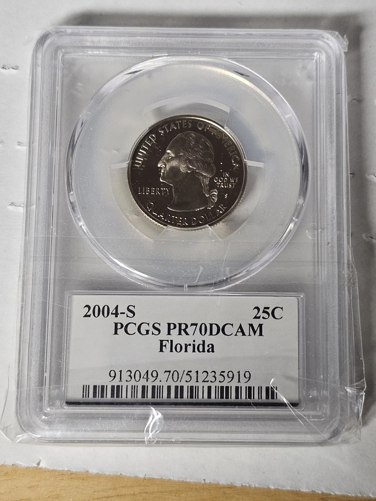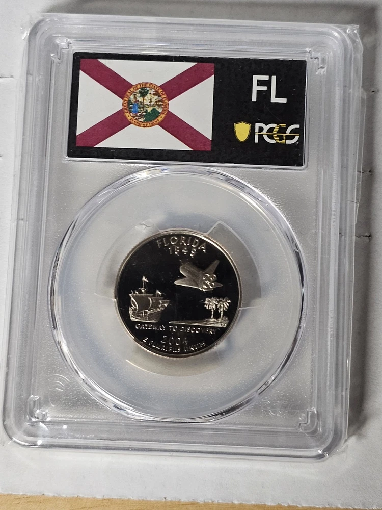 This is a 2004-S Clad Proof Florida State Quarter coin that has been certified by PCGS as PR70 DCAM. The coin features the State Flag of Florida and is an uncirculated single coin from the United States Mint in San Francisco. The denomination is 25 cents and it is a type of State Quarters coin. The certification number is the same as in the photos.
