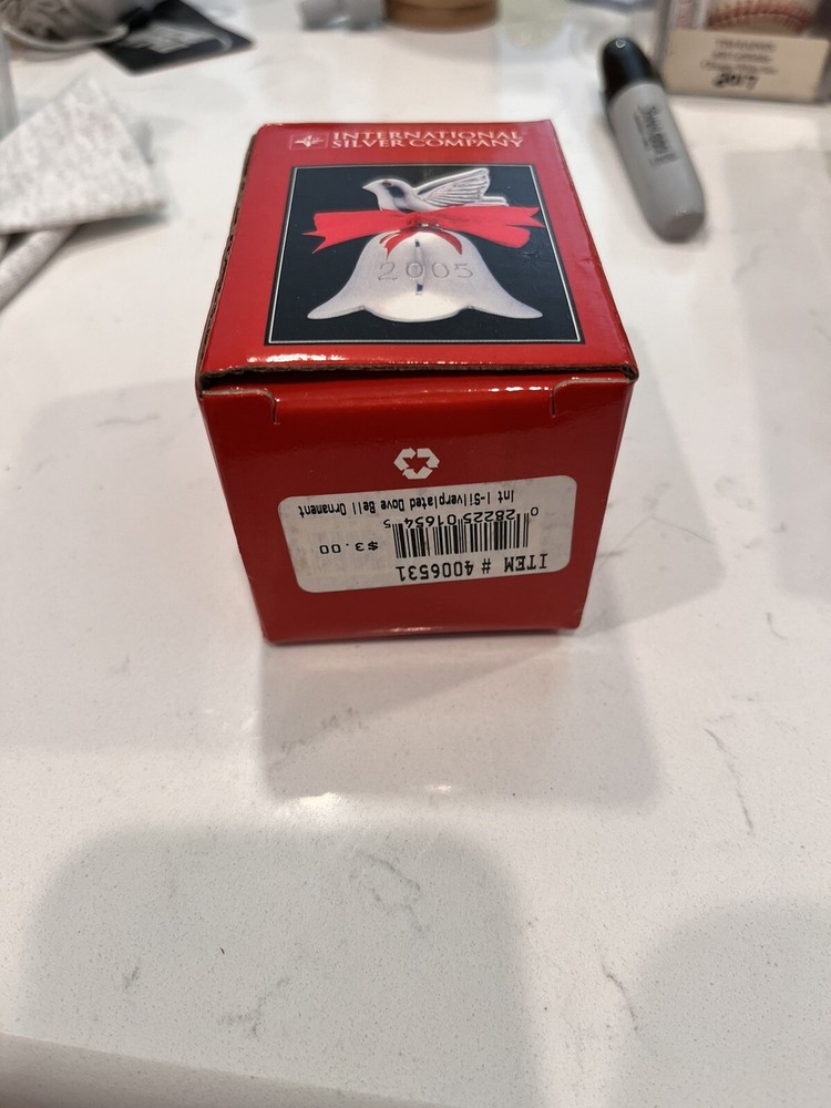 Add a touch of elegance to your holiday decor with this stunning 2005 International Silver Co. Silverplated Dove Bell Ornament. This beautiful ornament features a delicate dove design with a bell chime that adds a charming touch to any room. Crafted with high-quality silver plating, this ornament is perfect for collectors and enthusiasts alike. The ornament is 3.5 inches high and comes with a set that includes one ornament. It is a great addition to any ornament collection and makes for a fantastic gift. Celebrate the holiday season in style with this exquisite ornament. Item appears to be new. The box still shines and the ornament appears professionally wrapped. We got this at an estate sale and I won’t be able to wrap it up like factory wrapping.