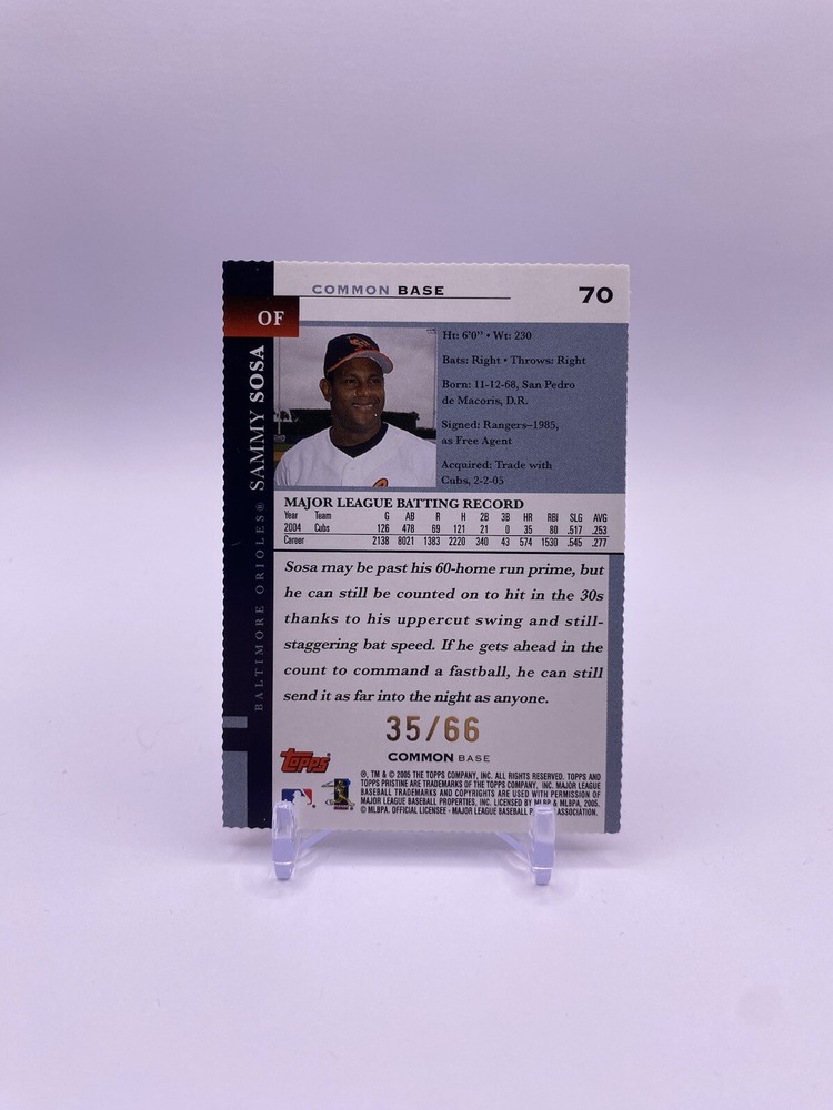 The product is a 2005 Topps Pristine Base Common Die-Cut trading card featuring Sammy Sosa of the Baltimore Orioles. This single-parallel card is serial numbered out of 66 and is an original release by Topps. As a part of the 2005 baseball trading card set, this card is a highly collectible item for fans and collectors of baseball memorabilia. Its unique die-cut design adds an extra element of interest to the card, making it a sought-after piece for fans of Sammy Sosa and the Topps Pristine series.