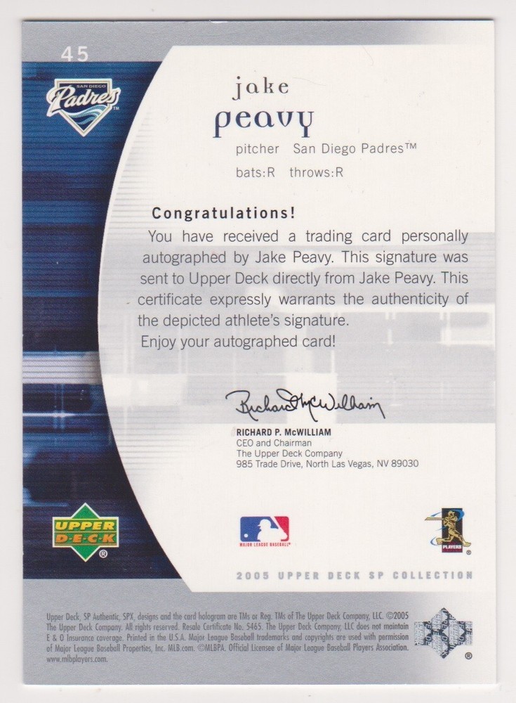 This is for ONE: 2005 Upper Deck SP Collection MLB Baseball JAKE PEAVY Certified autograph card # 45, serial # 134/475 ! Great looking card in very nice condition (see all pictures for exact shape) . Nice card for MLB Baseball, San Diego (S.D.) Padres or Jake Peavy f ans! I accept Paypal as payment & ship USPS. Card will be shipped with tracking & Signature confirmation. Check out my eBay store for many more Great items !!