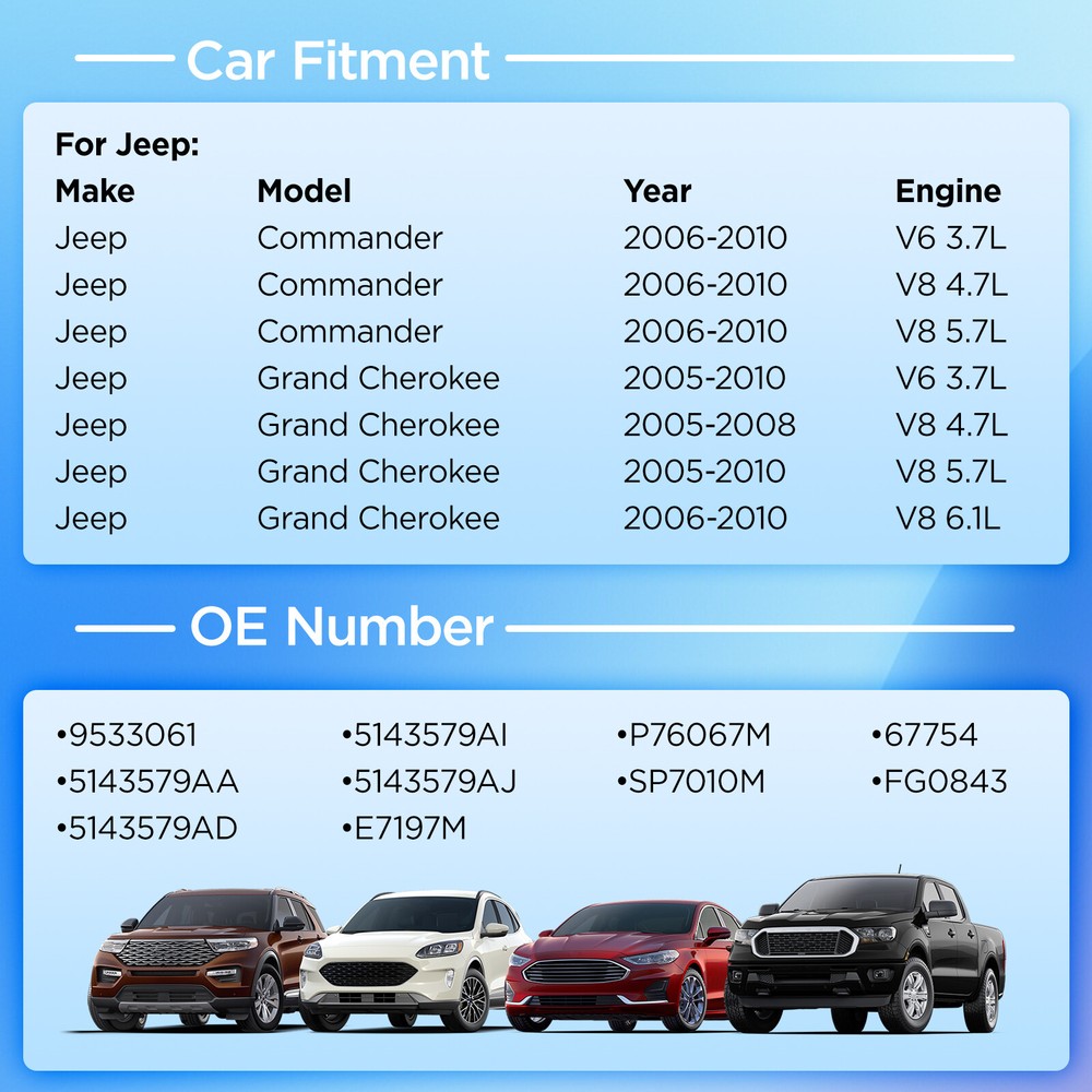 Package 1 x Fuel Pump Module Assembly? Manufacturer Number Airtex:E7197M Carter:P76067M Bosch:67754 Spectra Premium:SP7010M Delphi:FG0843 OEM:5143579AA 5143579AD 5143579AI 5143579AJ Fitment Chart 2006-2010 Jeep Commander V6-3.7L Fuel Pump Module Assembly 2006-2009 Jeep Commander V8-4.7L Fuel Pump Module Assembly 2006-2010 Jeep Commander V8-5.7L Fuel Pump Module Assembly 2005-2010 Jeep Grand Cherokee V6-3.7L Fuel Pump Module Assembly 2005-2008 Jeep Grand Cherokee V8-4.7L Fuel Pump Module Assembly 2005-2010 Jeep Grand Cherokee V8-5.7L Fuel Pump Module Assembly 2006-2010 Jeep Grand Cherokee V8-6.1L Fuel Pump Module Assembly Package 1 x Fuel Pump Module Assembly? Manufacturer Number Airtex:E7197M Carter:P76067M Bosch:67754 Spectra Premium:SP7010M Delphi:FG0843 OEM:5143579AA 5143579AD 5143579AI 5143579AJ Fitment Chart 2006-2010 Jeep Commander V6-3.7L Fuel Pump Module Assembly 2006-2009 Jeep Commander V8-4.7L Fuel Pump Module Assembly 2006-2010 Jeep Commander V8-5.7L Fuel Pump Module Assembly 2005-2010 Jeep Grand Cherokee V6-3.7L Fuel Pump Module Assembly 2005-2008 Jeep Grand Cherokee V8-4.7L Fuel Pump Module Assembly 2005-2010 Jeep Grand Cherokee V8-5.7L Fuel Pump Module Assembly 2006-2010 Jeep Grand Cherokee V8-6.1L Fuel Pump Module Assembly