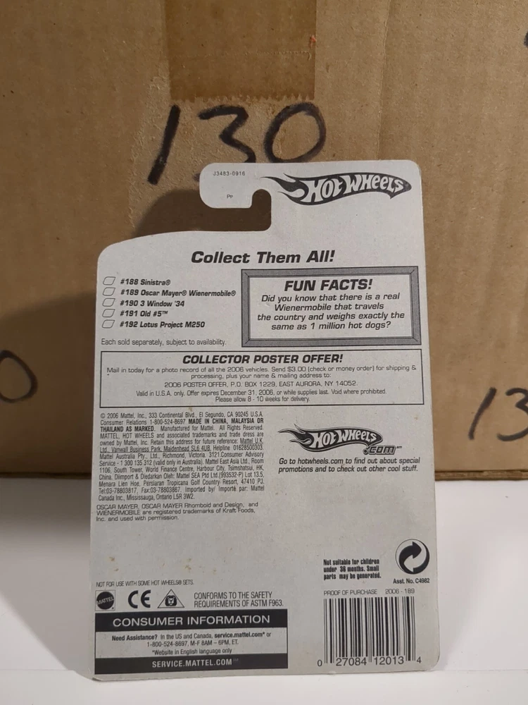 This 1:64 scale die-cast metal and plastic Hot Wheels car is a must-have for collectors and fans of the Oscar Mayer brand. The car features a red and yellow color scheme with gold 5 spoke wheels and comes in an unopened box. The vehicle is a Hot Wheels Mainline model from 2006 and is recommended for ages 3 and up. The car is part of the Die Cast Cars character family and was manufactured in Malaysia. It is a great addition to any collection and makes for a fun toy for boys and girls alike. Don't miss out on the opportunity to own this unique and rare Hot Wheels car. See pics for condition issues,,,dent on blister