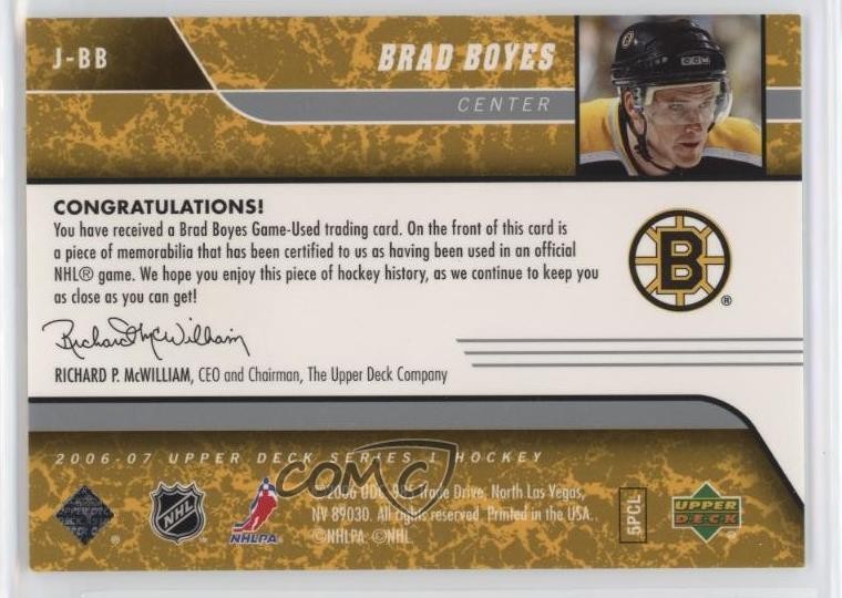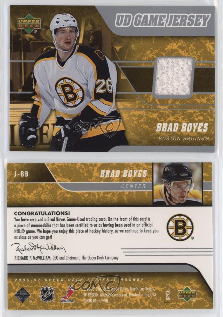 2006-07 Upper Deck - UD Game Jersey #J-BB Brad Boyes - Ice Hockey Card - Featuring the Boston Bruins - Featuring Brad Boyes Search for more: 2006-07 Upper Deck Search for more: 2006-07 Upper Deck - UD Game Jersey View all of our Listings Auctions Buy It Now About Us Located in the beautiful Pacific Northwest, COMC (Check Out My Cards) is the world's largest consignment service for trading card singles. More than 10,000 people have used our consignment service to list over 50 million trading cards. Find out how we can help you consign your items on eBay by contacting us through eBay messaging. COMC -- "The Safe & Easy Way to Buy & Sell" Representative Image - Select Specific Item above to see image of actual item Representative Image - Select Specific Item above to see image of actual item Raw Condition for Modern Cards Unless otherwise noted, raw modern cards are listed in Near Mint-Mint condition or better. A NM-MT card appears to be Mint at first glance, but upon closer inspection, may exhibit some of the following: minor print defects (e.g. roller marks, print line, dimple), minor scratches, slight edge wear, and slight corner wear. Centering is clearly visible in the images provided and does not factor into our condition assessment. Raw Condition for Vintage Cards Unless otherwise noted, raw vintage cards are listed in Excellent condition or better. An EX card may exhibit some of the following: minor rounding of corners, surface wear, print defects, light scratches, and slight edge wear/chipping. Centering is clearly visible in the images provided and does not factor into our condition assessment. Domestic Shipping Combined shipping for multiple items is available. To receive combined shipping, please ensure all desired items are in your eBay shopping cart before proceeding to checkout. eBay limits orders to 40 items per order. We automatically combine multiple orders placed on the same day. If you place multiple orders on the same day, please contact us to request a refund of applicable shipping costs. Signature confirmation may be required on invoices over $400. All cards are protected and shipped securely. International Shipping COMC offers eBay's International Shipping (EIS) for international orders under $2,500* (see country exceptions below). All duties and import fees are paid at checkout; in the rare event that there are additional import fees upon delivery, these are borne by the buyer. EIS packages route through a shipping hub in Erlanger, KY before shipping to their final destination. Please note that EIS does not allow for combined shipments. The shipping rates are determined by eBay and cannot be adjusted. *Maximum sale price exceptions: Colombia, Kuwait ($2,000); Taiwan ($1,539); Chile, Costa Rica, Guatemala, Honduras, Trinidad and Tobago ($1,000); Antigua and Barbuda, Aruba, Belize, Dominica, Grenada, Philippines, Saint Kitts and Nevis, Saint Lucia, Montserrat, Turks and Caicos Islands ($500); Dominican Republic, El Salvador ($200). Please request a shipping quote through eBay messaging for orders that exceed the maximum sale price supported by eBay's International Shipping. You will be responsible for all duties and import fees for international orders shipped outside the EIS. All cards are protected and shipped securely. Payment COMC does not accept offers on our cards through our eBay storefront. COMC utilizes eBay’s managed payments system. If you are experiencing difficulties making a payment, please contact eBay for assistance. Return Policy Returns are only accepted on the rare occasion the item is not as described. If you are making a return, please initiate the return process through eBay so a mailing label can be provided for you. Prior to listing, our expert team carefully assessed this item to represent it accurately. Please review the description and high-definition images prior to purchasing to ensure this item meets your satisfaction. We welcome you to contact us if you have further questions about this item. Trust and Integrity COMC carefully assesses each item consigned to us to prevent fraudulent items from entering the marketplace. If you believe an item offered on COMC may be fraudulent, please contact us with details so we can investigate the issue. Items we determine are outside our supported items policy may be removed. Last Modified: 11/20/2025 8:28:44 PM PDT