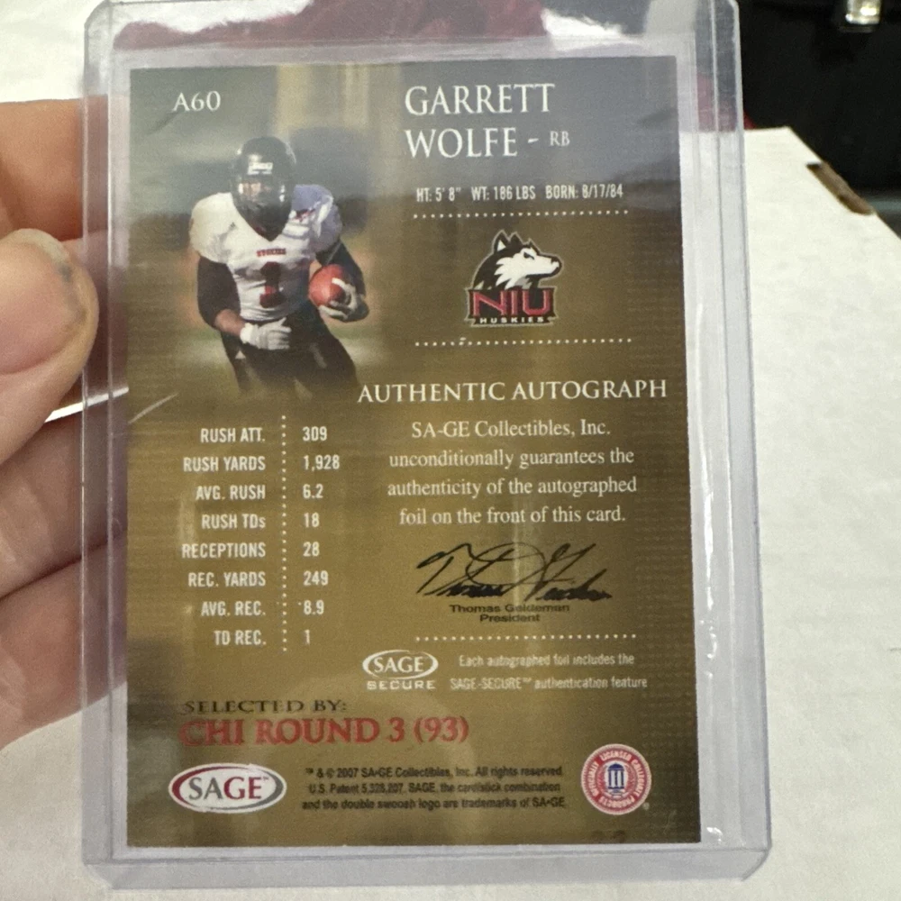 This 2007 Sage Garrett Wolfe Auto Rookie football card is a great addition to any sports trading card collection. The card features a signature from the former Northern Illinois Huskies running back, Garrett Wolfe, who played for the team from 2004 to 2007. The card is part of the 2007 Sage set and is an original, not a licensed reprint. The card is in great shape and has been well-preserved over the years. It is a standard size trading card and has the card number A60. This card is perfect for fans of the National Collegiate Athletic Association (NCAA) and collectors of football trading cards.