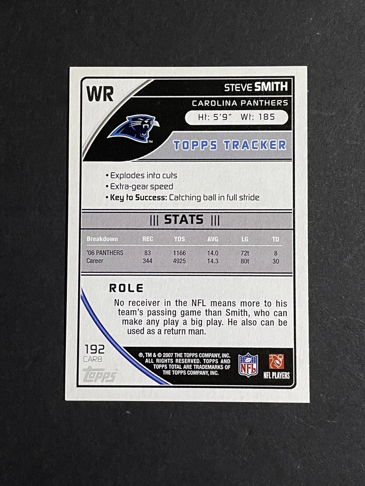 Type: Sports Trading Card Sport: Football Player/Athlete: Steve Smith Language: English Manufacturer: Topps Season: 2007 Material: Card Stock Card Number: 192 League: National Football League (NFL) Set: 2007 Topps Total Autographed: No Features: Parallel/Variety Country/Region of Manufacture: United States Parallel/Variety: Gold Original/Licensed Reprint: Original Card Size: Standard Team: Miami Dolphins, Buffalo Bills, New York Jets, Denver Broncos, New England Patriots, Kansas City Chiefs, Oakland Raiders, San Diego Chargers, Indianapolis Colts, Jacksonville Jaguars, Cincinnati Bengals, Pittsburgh Steelers, Cleveland Browns, Dallas Cowboys, New York Giants, Philadelphia Eagles, Washington Commanders, Tampa Bay Buccaneers, Atlanta Falcons, Carolina Panthers, San Francisco 49ers, Seattle Seahawks, Arizona Cardinals, Los Angeles Rams, Green Bay Packers, Detroit Lions, Minnesota Vikings, Chicago Bears