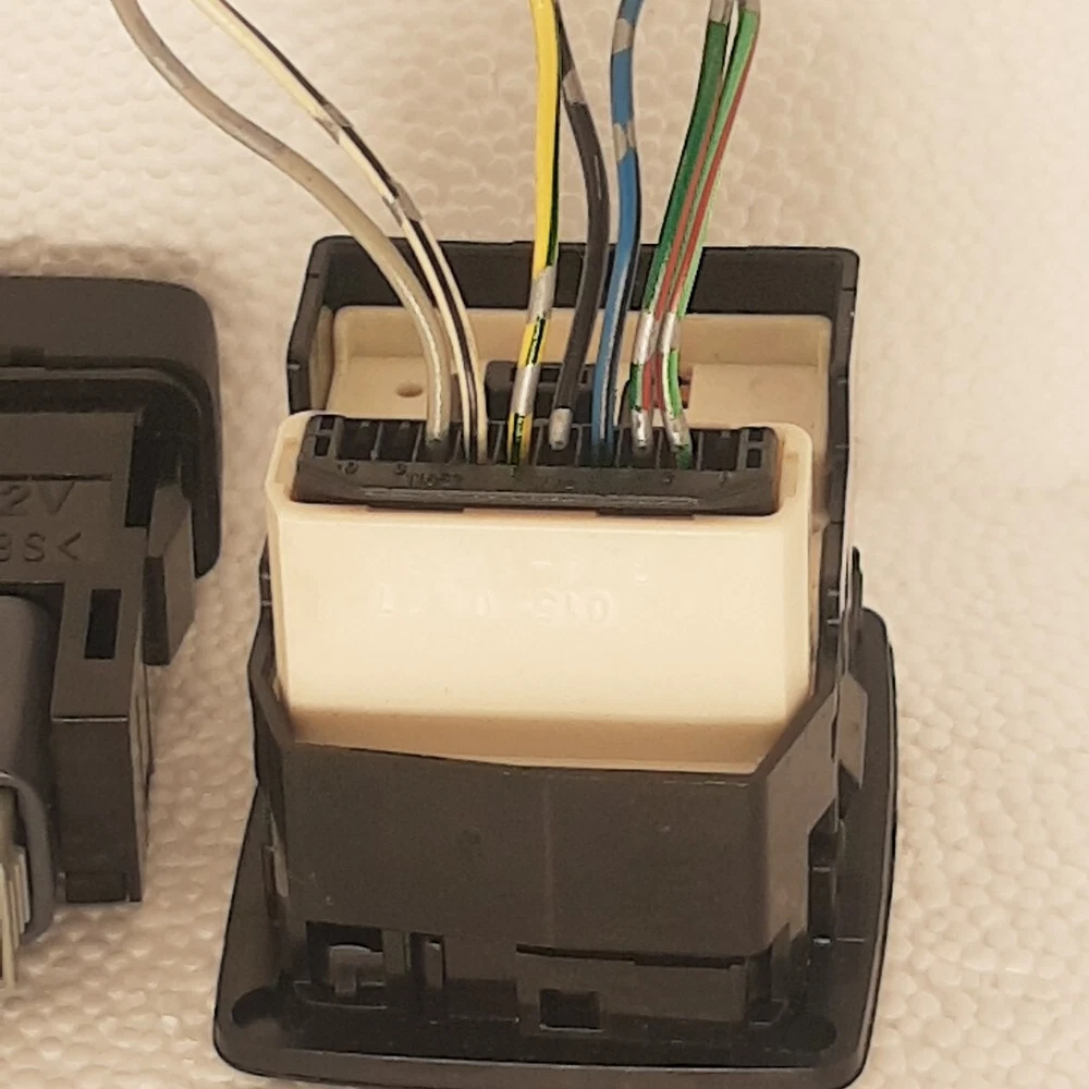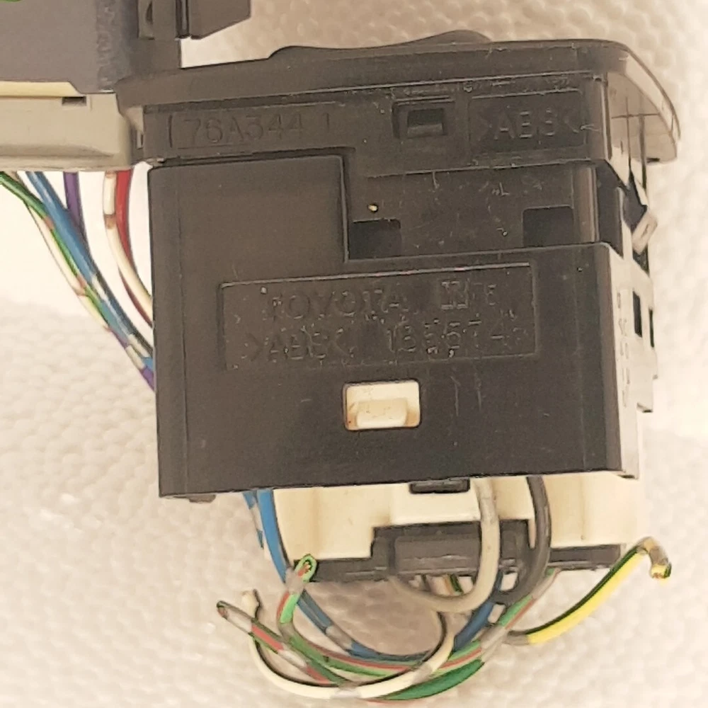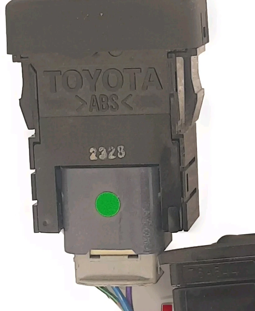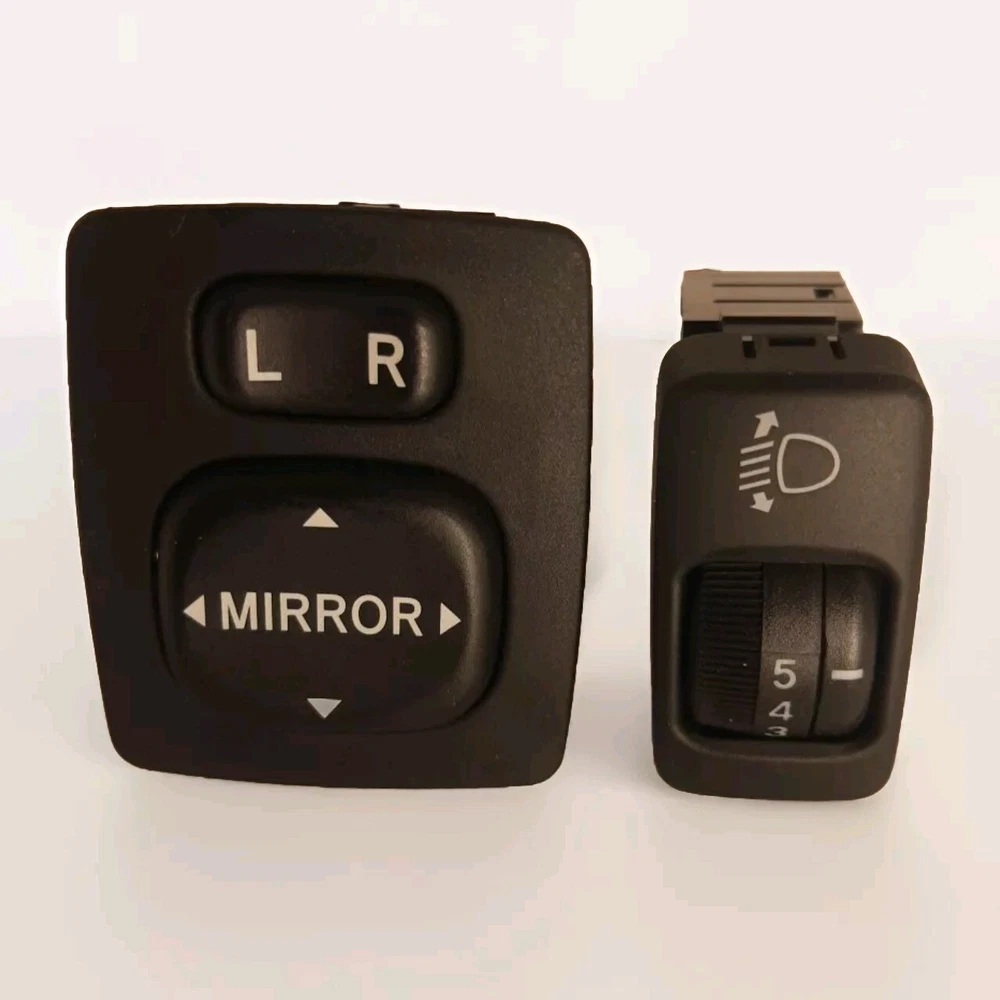 The Part was removed from 2007 Toyota Solara This is a headlight level control switch and side mirror's control for a 2007 Toyota Solara. The switch assembly is a direct replacement and is made in Japan. It is black in color and is designed to control the wing mirror and headlight level. The switch features are durable and it is not a vintage or performance part. The placement of the switch is on the front left side of the dashboard.