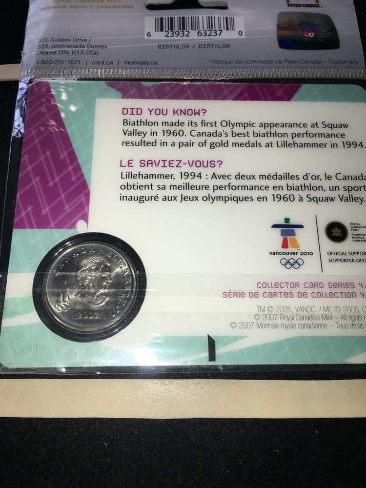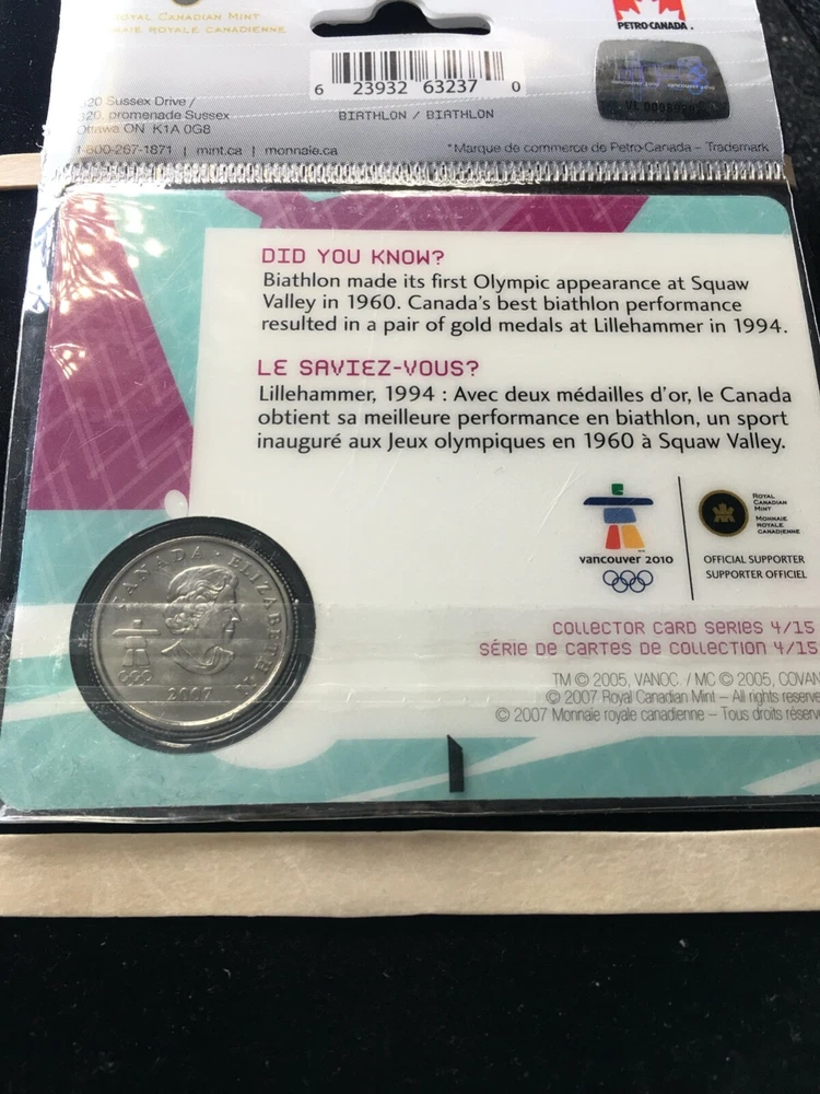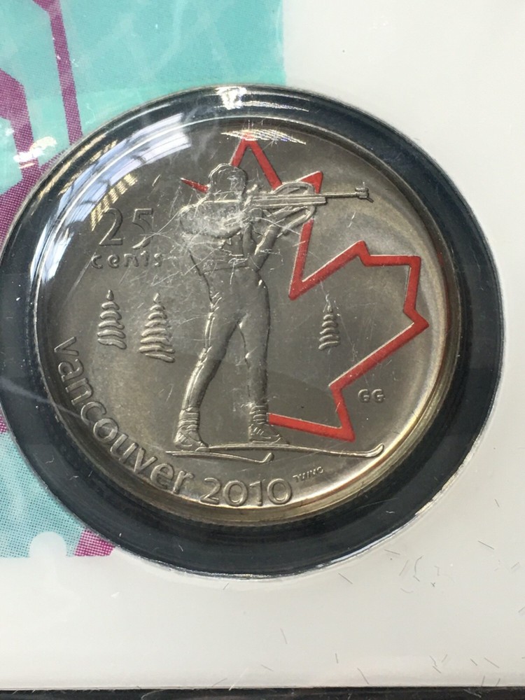 You are bidding on a **2007** Canadian, "Vancouver Olympics Biathlon" Uncirculated ¢25 Coin & Card Set.. The coin pictured is the actual coin that you will receive. We do offer combined shipping at a rate of $1 per extra item, excluding Sets, Lots Large sized items and most Mint Product. If you have ANY QUESTIONS or CONCERNS, please contact us BEFORE BIDDING. We do not ship to all locations. Our shipping rates to the US are the same as Canada with the exception of items that exceed $100. If your purchase exceed $100 we need to send it Xpress Post Registered at a cost of $19.95 TERMS - Do not bid if you don't agree to these terms! Request an invoice after you're done bidding on all your items, to make sure shipping is correct. Please do not make a payment until you receive proper invoice. Canadian customers MUST pay applicable taxes. *PURE SILVER & GOLD COINS GST / HST EXEMPT * Coins are guaranteed to be authentic unless clearly listed in the item description. We will guarantee all our grades to be 100% accurate. If your not happy with our opinion please return the coin within 14 days. If you have ANY questions or concerns, please contact us before bidding.. Local pick up is available in Coquitlam, by appointment only. Please contact us for a time: B.C. Coin Mart If you require a quantity of more than one, please check with us as we try to keep only the one available showing. We may have more in stock B.C. Coin Mart is a registered business located in Coquitlam B.C. Business Licence Number #15 101421 GST# 816846398 RT0001 As such we are required by Law to collect and submit any applicable taxes. This is done in accordance with Canada Revenue. We have no control over this. Please understand that this is a part of doing business in Canada..