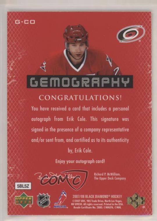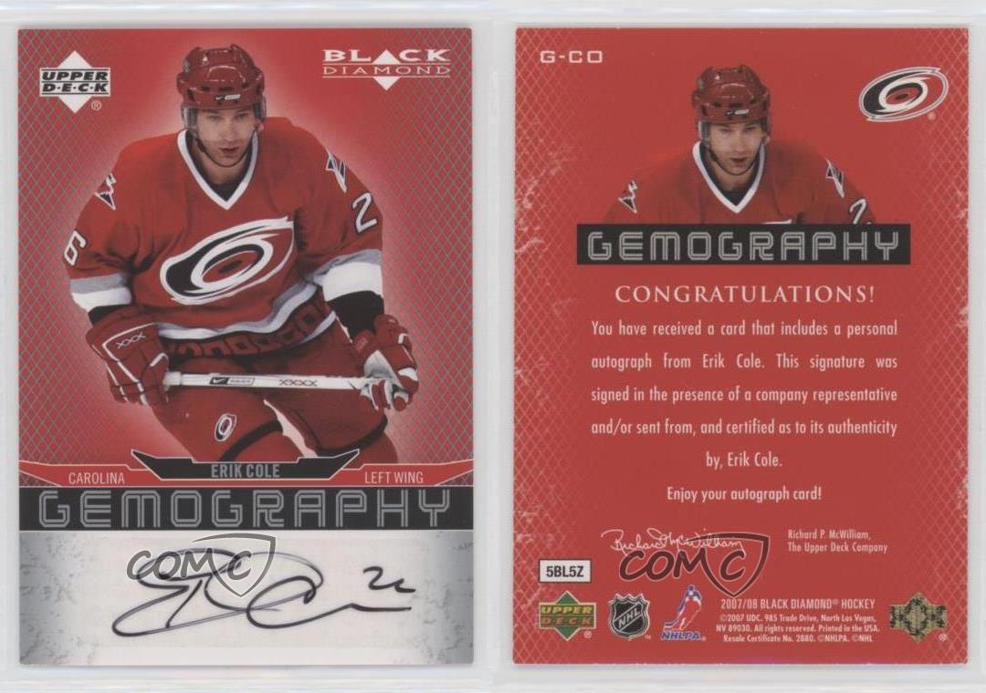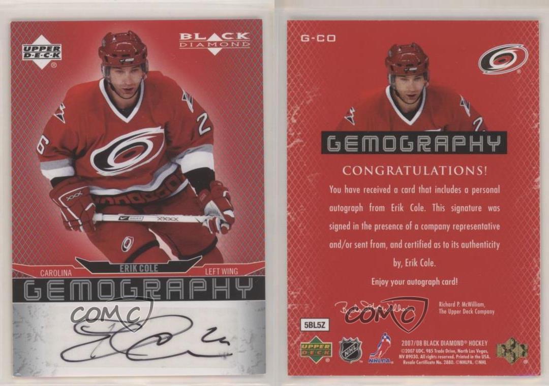 2007-08 Upper Deck Black Diamond - Gemography #G-CO Erik Cole - Ice Hockey Card - Featuring the Carolina Hurricanes - Featuring Erik Cole Search for more: 2007-08 Upper Deck Black Diamond Search for more: 2007-08 Upper Deck Black Diamond - Gemography View all of our Listings Auctions Buy It Now About Us Located in the beautiful Pacific Northwest, COMC (Check Out My Cards) is the world's largest consignment service for trading card singles. More than 10,000 people have used our consignment service to list over 50 million trading cards. Find out how we can help you consign your items on eBay by contacting us through eBay messaging. COMC -- "The Safe & Easy Way to Buy & Sell" Representative Image - Select Specific Item above to see image of actual item Representative Image - Select Specific Item above to see image of actual item Raw Condition for Modern Cards Unless otherwise noted, raw modern cards are listed in Near Mint-Mint condition or better. A NM-MT card appears to be Mint at first glance, but upon closer inspection, may exhibit some of the following: minor print defects (e.g. roller marks, print line, dimple), minor scratches, slight edge wear, and slight corner wear. Centering is clearly visible in the images provided and does not factor into our condition assessment. Raw Condition for Vintage Cards Unless otherwise noted, raw vintage cards are listed in Excellent condition or better. An EX card may exhibit some of the following: minor rounding of corners, surface wear, print defects, light scratches, and slight edge wear/chipping. Centering is clearly visible in the images provided and does not factor into our condition assessment. Domestic Shipping Combined shipping for multiple items is available. To receive combined shipping, please ensure all desired items are in your eBay shopping cart before proceeding to checkout. eBay limits orders to 40 items per order. We automatically combine multiple orders placed on the same day. If you place multiple orders on the same day, please contact us to request a refund of applicable shipping costs. Signature confirmation may be required on invoices over $400. All cards are protected and shipped securely. International Shipping COMC offers eBay's International Shipping (EIS) for international orders under $2,500* (see country exceptions below). All duties and import fees are paid at checkout; in the rare event that there are additional import fees upon delivery, these are borne by the buyer. EIS packages route through a shipping hub in Erlanger, KY before shipping to their final destination. Please note that EIS does not allow for combined shipments. The shipping rates are determined by eBay and cannot be adjusted. *Maximum sale price exceptions: Colombia, Kuwait ($2,000); Taiwan ($1,539); Chile, Costa Rica, Guatemala, Honduras, Trinidad and Tobago ($1,000); Antigua and Barbuda, Aruba, Belize, Dominica, Grenada, Philippines, Saint Kitts and Nevis, Saint Lucia, Montserrat, Turks and Caicos Islands ($500); Dominican Republic, El Salvador ($200). Please request a shipping quote through eBay messaging for orders that exceed the maximum sale price supported by eBay's International Shipping. You will be responsible for all duties and import fees for international orders shipped outside the EIS. All cards are protected and shipped securely. Payment COMC does not accept offers on our cards through our eBay storefront. COMC utilizes eBay’s managed payments system. If you are experiencing difficulties making a payment, please contact eBay for assistance. Return Policy Returns are only accepted on the rare occasion the item is not as described. If you are making a return, please initiate the return process through eBay so a mailing label can be provided for you. Prior to listing, our expert team carefully assessed this item to represent it accurately. Please review the description and high-definition images prior to purchasing to ensure this item meets your satisfaction. We welcome you to contact us if you have further questions about this item. Trust and Integrity COMC carefully assesses each item consigned to us to prevent fraudulent items from entering the marketplace. If you believe an item offered on COMC may be fraudulent, please contact us with details so we can investigate the issue. Items we determine are outside our supported items policy may be removed. Last Modified: 11/20/2025 8:07:31 PM PDT