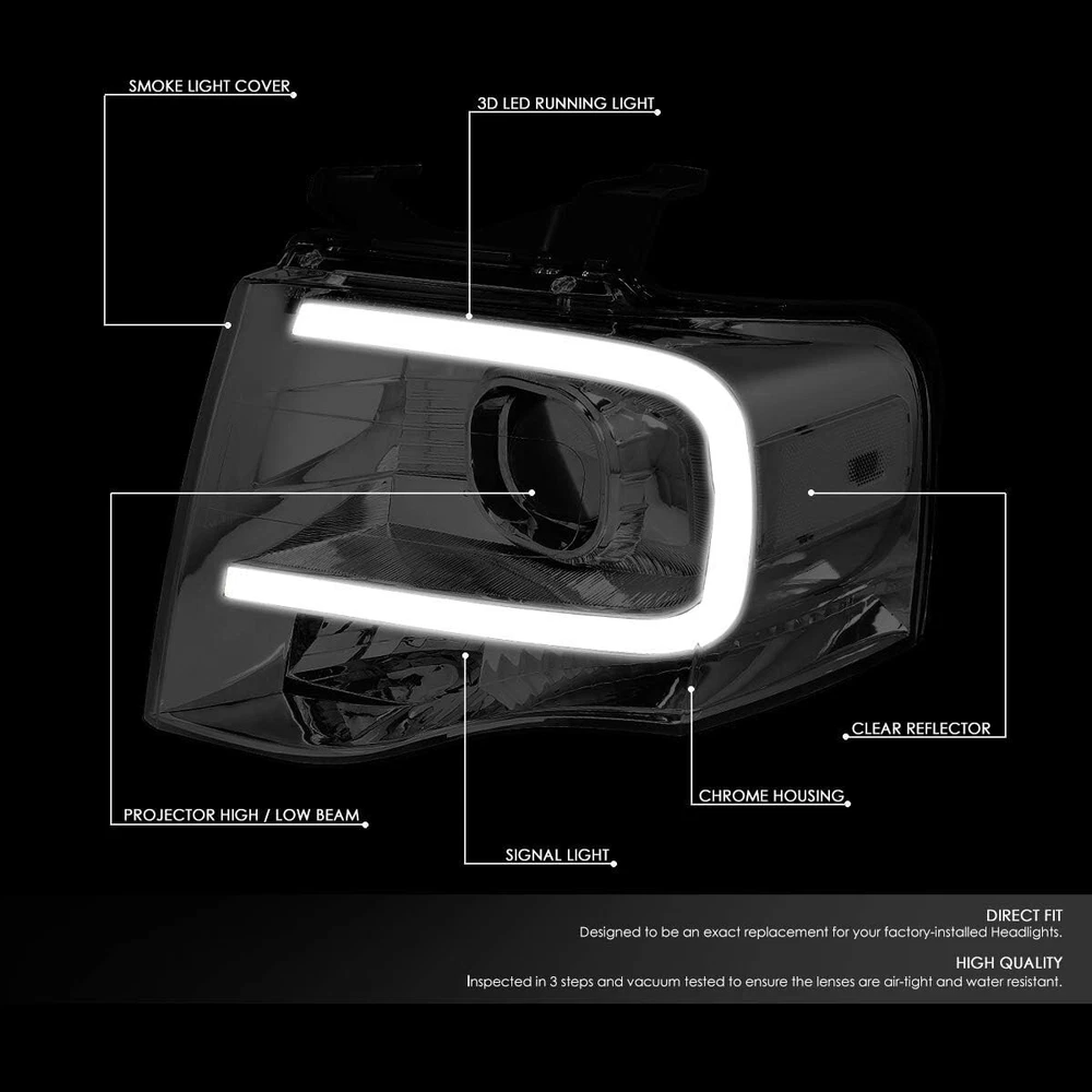 Brand Auto Dynasty Color Smoked Vehicle Service Type Compatible with Ford Expedition 2007-2014 Special Feature Halogen, Motorized Actuator, LED Running Light Strip, Projector High / Low Beam, Smoked Lens Auto Part Position Front Lens Color smoke Lens Material Polycarbonate Item dimensions L x W x H 26 x 19 x 10 inches Assembly Required No Manufacturer Auto Dynasty Light Source Type H7 High / Low Beam Voltage 12 Volts About this item Vehicle Compatibility - These light are compatible with Ford Expedition 2007-2014, fits halogen headlight models Only. Brighter Illumination - Come with set of [2] headlights with LED daytime running light strip and turn signal, offering a path with clearer light when driving, can replace the old or damaged one for upgrading the appearance of vehicle. More, it has motorized actuator to switch projector beam from low to high. Extraordinary Quality - It is constructed of highly durable polycarbonate material for preventing cracking, waterproof-sealed to keep driving illumination good, can ensure an extremely long lasting operate life in outdoor conditions, including the heavy weather. Simple Installation - Direct bolt-on OE fitment and replacement for factory unit, easy to install without any drilling or modification. Please note: LED requires wiring to existing lights. Product Specification - Bulb Type: Halogen | Beam Type: Projector Low Beam | Bulb Model: H7 High / Low Beam (Included) | Signal Light: 3157A | Housing Color: Chrome | Lens Color: Smoked | OEM Part Number: 7L1Z13008BB 7L1Z13008AB | Parkslink Number: FO2502226 FO2503226