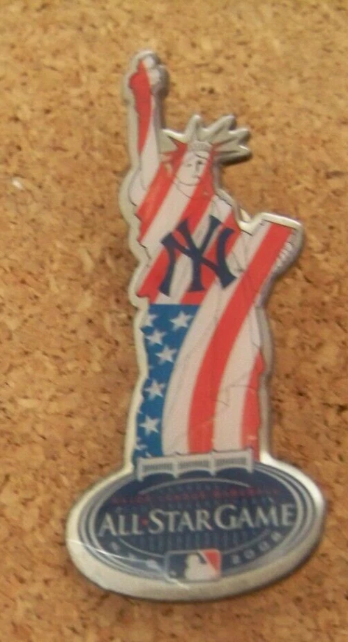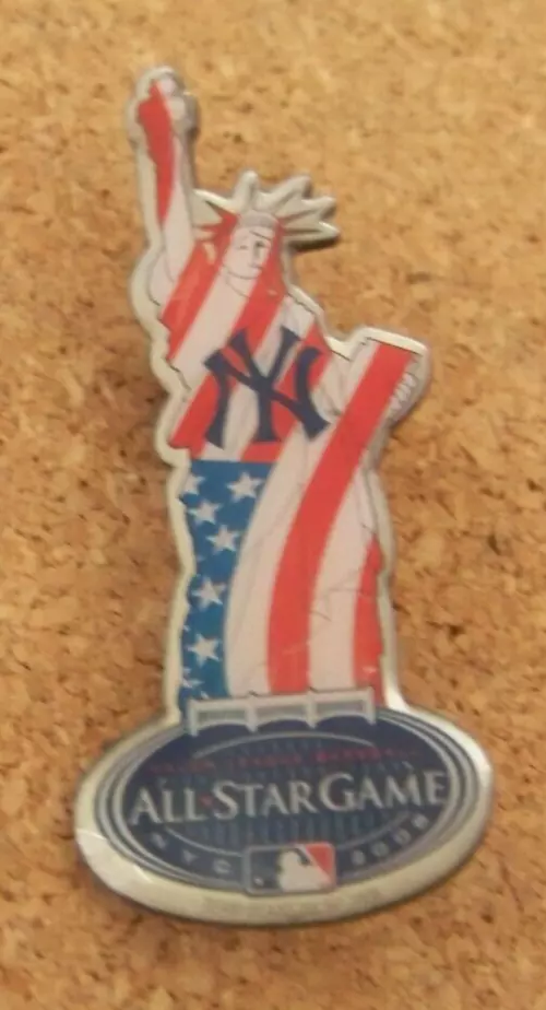 2008 All-Star Game All-Star design #5 Statues on Parade pin. This MLB licensed double post and butterfly clip backed pin measures about 1" wide, by 2-1/2" long. and is rimmed/backed in shiny silver tones. Included in the design is a drawing of Yankee Stadium including the bat smokestack. This pin is one of a series of 42, each design of which replicates the Statues on Parade statues. There is one pin for each of the different 8-1/2' Statue of Liberty statues that were set up around New York City. Finding all the 9" replica statues, aside from the New York related team designs and All Star Game itself designs, is difficult and next to impossible, but the lapel pins are even worse. Check out my other listings for the availability of other teams in both the statues and pins. At the bottom is the "Major League Baseball" version of the 2008 All-Star Game logo. Comes in original resealable packaging. The scan usually shows shiny surfaces - silver tones as dark. NYY, N.Y., N Y, AllStar, Major League Baseball, NYC, N.Y.C., N. Y. C. AS A.S. A S A. S. Although new, this pin came off of a display board and never had protective packaging. Light nicks and marks. Light yellowing. Don’t forget to click on my "Stores" link, next to my eBay name, to see other items I currently have listed for sale, or you can copy and paste this address into your browser: stores.ebay.com/highcountrycollectibles SHIPPING INFORMATION Shipping to U.S. addresses is FREE! HIGH COUNTRY COLLECTIBLES Since 1989 – A LEADER IN THE DENVER SPORTS MEMORABILIA MARKET. Check out my other auctions and listings, and keep an eye out for the different, unusual, and EXCLUSIVE items available nowhere else but from High Country Collectibles.