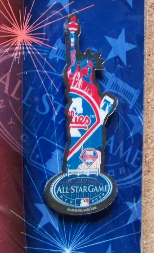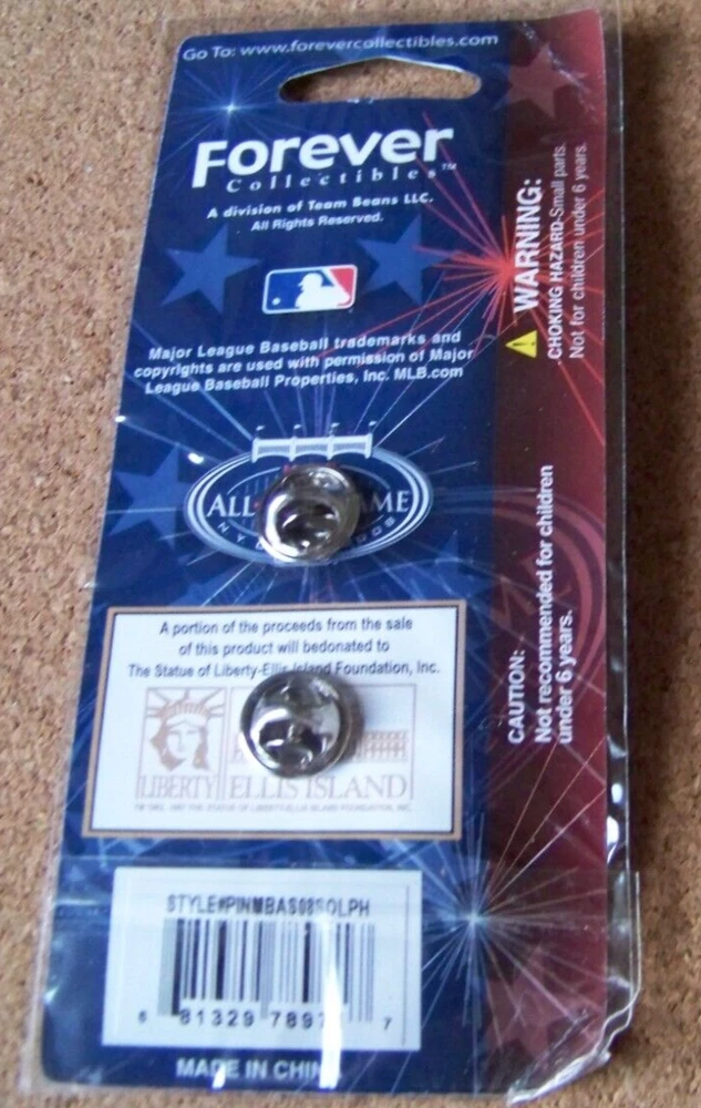 2008 All-Star Game Philadelphia Phillies Statues on Parade pin. This MLB licensed double post and butterfly clip backed pin measures about 1" wide, by 2-1/2" long. and is rimmed/backed in shiny silver tones. New, unopened but the backing card has two small creases across the left side corners. Included in the design are various logos of the Phillies. This pin is one of a series of 42, each design of which replicates the Statues on Parade statues. There is one pin for each of the different 8-1/2' Statue of Liberty statues that were set up around New York City. Finding all the 9" replica statues, aside from the New York related team designs and All Star Game itself designs, is difficult and next to impossible, but the lapel pins are even worse. Check out my other listings for the availability of other teams in both the statues and pins. At the bottom is the "Major League Baseball" version of the 2008 All-Star Game logo. Comes in original resealable packaging. The scan usually shows shiny surfaces - silver tones as dark. N.Y., N Y, AllStar, Major League Baseball, NYC, N.Y.C., N. Y. C. AS A.S. A S A. S. Don’t forget to click on my "Stores" link, next to my eBay name, to see other items I currently have listed for sale, or you can copy and paste this address into your browser: stores.ebay.com/highcountrycollectibles SHIPPING INFORMATION Shipping to U.S. addresses is FREE! HIGH COUNTRY COLLECTIBLES Since 1989 – A LEADER IN THE DENVER SPORTS MEMORABILIA MARKET. Check out my other auctions and listings, and keep an eye out for the different, unusual, and EXCLUSIVE items available nowhere else but from High Country Collectibles