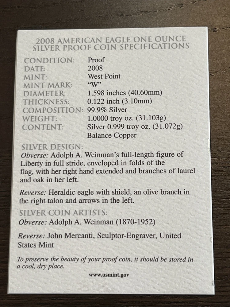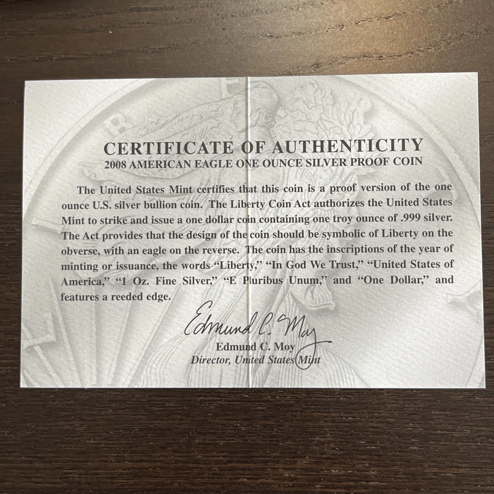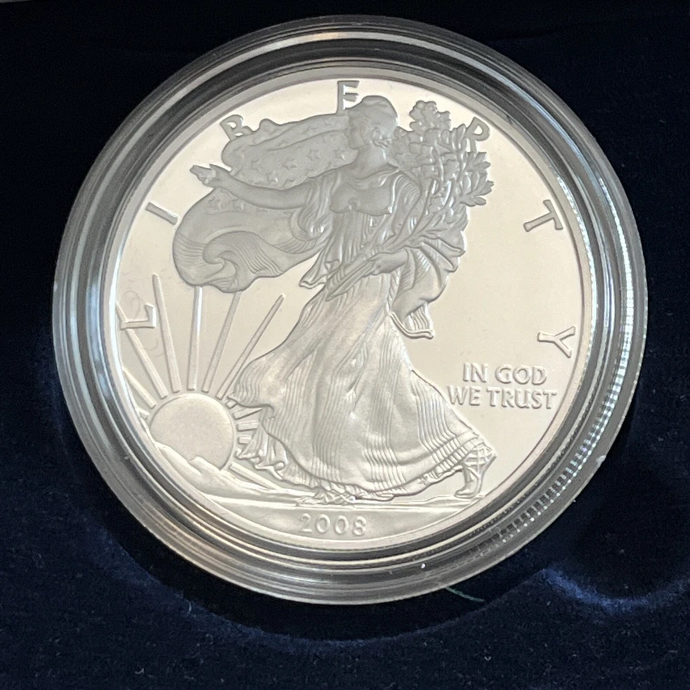 2008 W $1 PROOF SILVER EAGLE DOLLAR WITH BOX AND COA