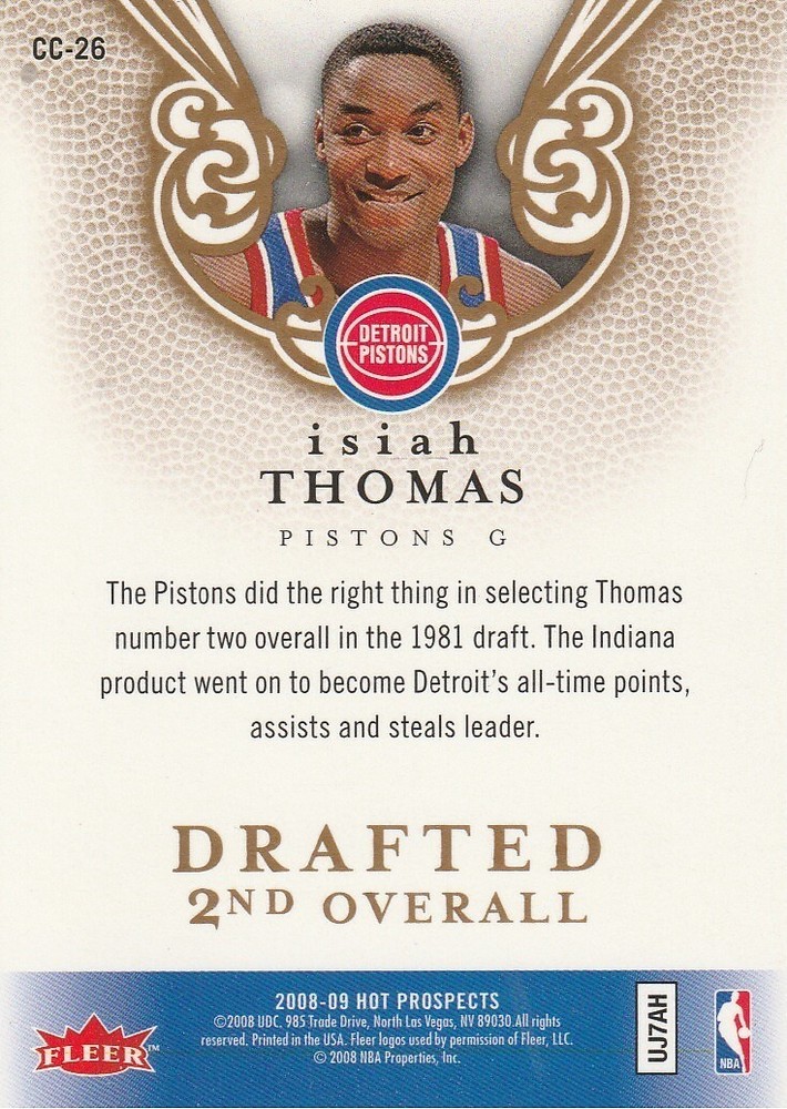 Manufacturer:FleerType:Sports Trading CardLeague:National Basketball Association (NBA)Features:Single-InsertTeam:Detroit PistonsSet:2008-09 Hot Prospects Cream of the CropPlayer/Athlete:Isiah ThomasCard Number:CC 26Sport:Basketball