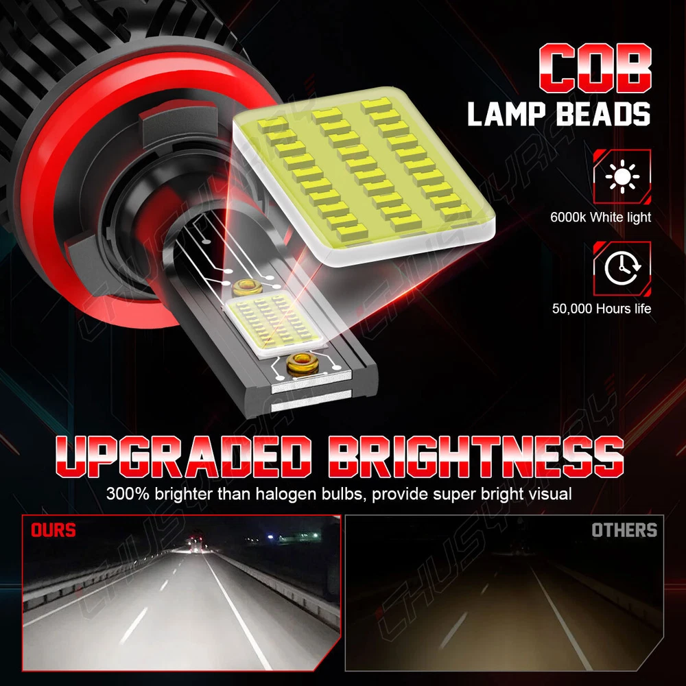 LED Headlight Kit All-in-One Conversion Kit 300% Brighter than Halogen: 100W 6000K cool white, 1w=100lm, with clear visibility and perfect beam pattern, so you can enjoy good vision while driving at night. Super Focused Beam Pattern: led bulbs with 1.0mm ultra-thin centered light emitting. No dark spots or foggy light, do not blind oncoming traffic. 10mins Easy Installation: The LED bulb’s almost 1:1 design as halogen. Plug and play. No other tools are needed 360° Adjustable Beam Pattern: Adopts 360° adjustable locker ring to ensure the best beam pattern. 50,000 hours Lifespan: Led Bulb comes with a copper base board, cold pressed aluminum heat sink and 12,000rmp cooling fan. Better solve the dimming or over heated of led bulbs. Energy-saving: Brighter light output with much less power consumption. Package Included: 4 pcs H9+H11 LED Bulbs . Note:Our LED replaces halogen bulbs ONLY. It does not replace HID or LED from factory. Item Specifics Technology: LED Fitment Type: Direct Replacement Voltage: DC 9-30V Power: 100W/per pair Luminous Flux: 10000LM/per pair Color Temperature: 6500K LED Chips: COB LED chips LED Drivers: Built-in Drivers Lifespan: Over 50,000 hours Waterproof Rate: IP67 Water and Dust Seal, CE, RoHS Operating Temperature: -40℃~+80℃ Warranty: 5 years warranty Application: Headlight High Beam & Low Beam & Foglight DRL Warm Tips: If you are not sure about the bulb size, please send us your vehicles' make/model/year via ebay message to confirm with us before purchasing. Any questions please feel free to contact us, we will help you solve it. Information: a)Compatible List can not show up all Car model. Please check the Correct item size of your vechicle. it will work and fit.Thank you! b)If you are unsure the item fit or not , please do remember send message to tell us your car make, model, year and other information which is helpful to check the item fit or not.For example: For 2004 Ford F 150, high/low beam For 2015 RAM 1500 with projector-type, high beam For 2019 Ford F 150 ,XL Crew Cab Pickup 4-Door 2.7L On Nov 19, 2024 at 02:18:40 PST, seller added the following information: