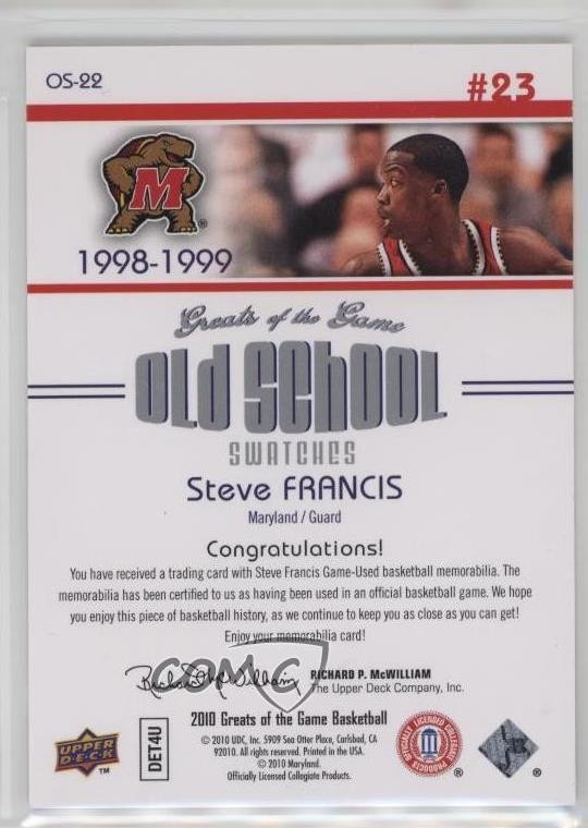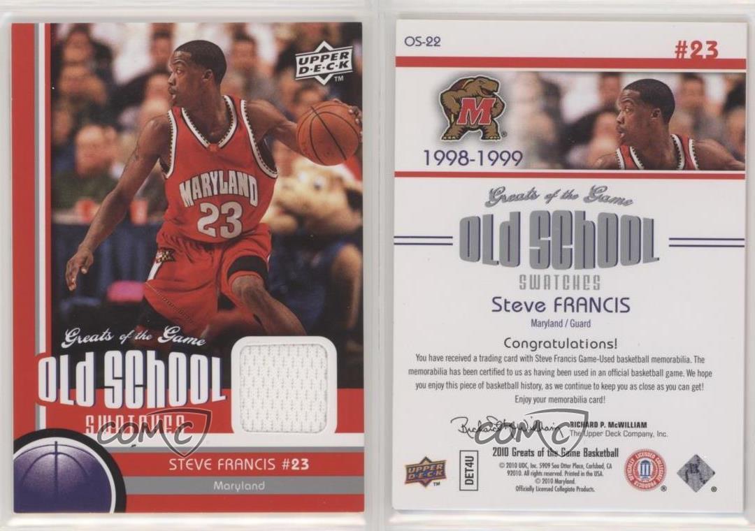 2009-10 Upper Deck Greats of the Game - Old School Swatches #OS-22 Steve Francis - Basketball Card - Featuring the Maryland Terrapins - Featuring Steve Francis Search for more: 2009-10 Upper Deck Greats of the Game Search for more: 2009-10 Upper Deck Greats of the Game - Old School Swatches View all of our Listings Auctions Buy It Now About Us Located in the beautiful Pacific Northwest, COMC (Check Out My Cards) is the world's largest consignment service for trading card singles. More than 10,000 people have used our consignment service to list over 50 million trading cards. Find out how we can help you consign your items on eBay by contacting us through eBay messaging. COMC -- "The Safe & Easy Way to Buy & Sell" Representative Image - Select Specific Item above to see image of actual item Representative Image - Select Specific Item above to see image of actual item Raw Condition for Modern Cards Unless otherwise noted, raw modern cards are listed in Near Mint-Mint condition or better. A NM-MT card appears to be Mint at first glance, but upon closer inspection, may exhibit some of the following: minor print defects (e.g. roller marks, print line, dimple), minor scratches, slight edge wear, and slight corner wear. Centering is clearly visible in the images provided and does not factor into our condition assessment. Raw Condition for Vintage Cards Unless otherwise noted, raw vintage cards are listed in Excellent condition or better. An EX card may exhibit some of the following: minor rounding of corners, surface wear, print defects, light scratches, and slight edge wear/chipping. Centering is clearly visible in the images provided and does not factor into our condition assessment. Domestic Shipping Combined shipping for multiple items is available. To receive combined shipping, please ensure all desired items are in your eBay shopping cart before proceeding to checkout. eBay limits orders to 40 items per order. We automatically combine multiple orders placed on the same day. If you place multiple orders on the same day, please contact us to request a refund of applicable shipping costs. Signature confirmation may be required on invoices over $400. All cards are protected and shipped securely. International Shipping COMC offers eBay's International Shipping (EIS) for international orders under $2,500* (see country exceptions below). All duties and import fees are paid at checkout; in the rare event that there are additional import fees upon delivery, these are borne by the buyer. EIS packages route through a shipping hub in Erlanger, KY before shipping to their final destination. Please note that EIS does not allow for combined shipments. The shipping rates are determined by eBay and cannot be adjusted. *Maximum sale price exceptions: Colombia, Kuwait ($2,000); Taiwan ($1,539); Chile, Costa Rica, Guatemala, Honduras, Trinidad and Tobago ($1,000); Antigua and Barbuda, Aruba, Belize, Dominica, Grenada, Philippines, Saint Kitts and Nevis, Saint Lucia, Montserrat, Turks and Caicos Islands ($500); Dominican Republic, El Salvador ($200). Please request a shipping quote through eBay messaging for orders that exceed the maximum sale price supported by eBay's International Shipping. You will be responsible for all duties and import fees for international orders shipped outside the EIS. All cards are protected and shipped securely. Payment COMC does not accept offers on our cards through our eBay storefront. COMC utilizes eBay’s managed payments system. If you are experiencing difficulties making a payment, please contact eBay for assistance. Return Policy Returns are only accepted on the rare occasion the item is not as described. If you are making a return, please initiate the return process through eBay so a mailing label can be provided for you. Prior to listing, our expert team carefully assessed this item to represent it accurately. Please review the description and high-definition images prior to purchasing to ensure this item meets your satisfaction. We welcome you to contact us if you have further questions about this item. Trust and Integrity COMC carefully assesses each item consigned to us to prevent fraudulent items from entering the marketplace. If you believe an item offered on COMC may be fraudulent, please contact us with details so we can investigate the issue. Items we determine are outside our supported items policy may be removed. Last Modified: 11/21/2025 7:11:03 AM PDT