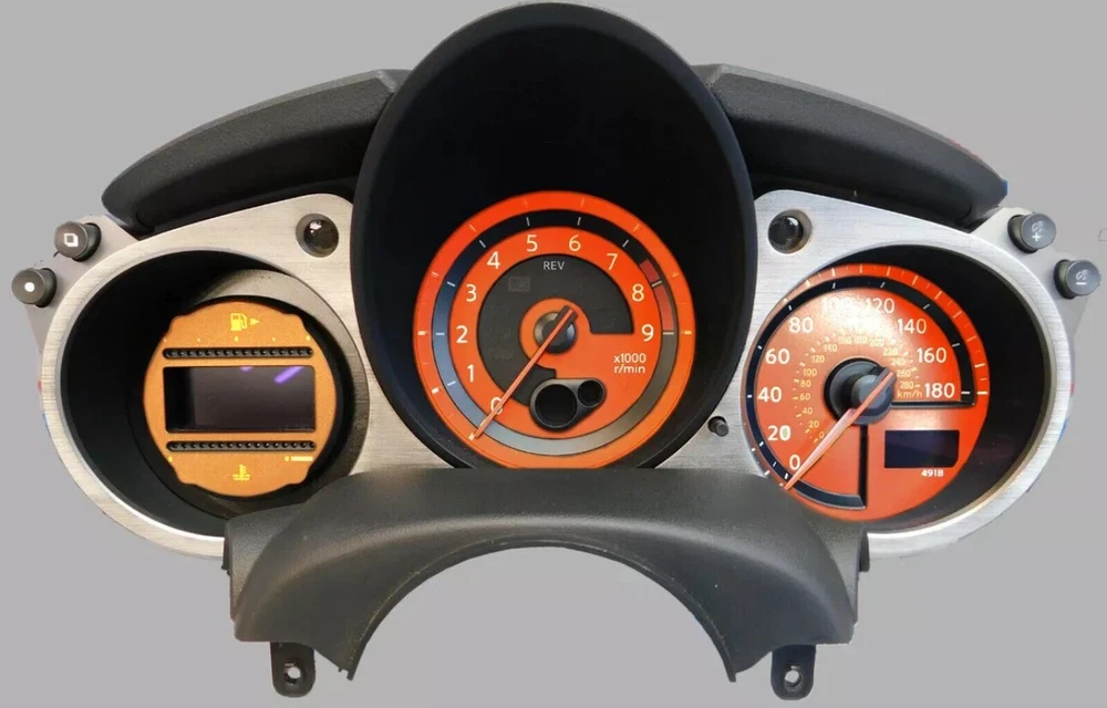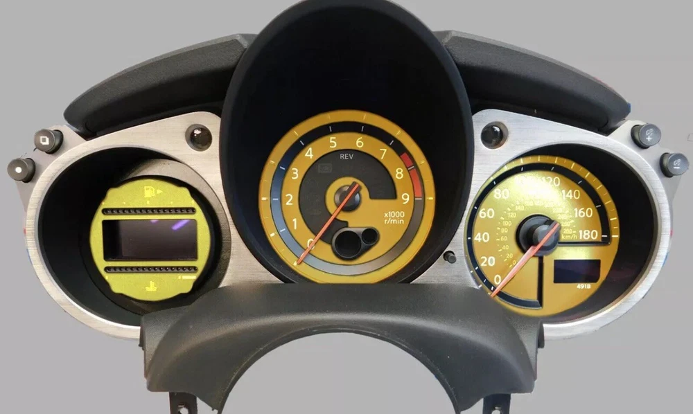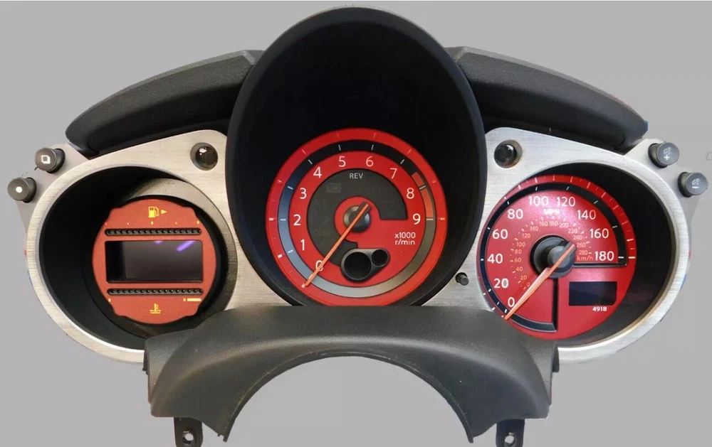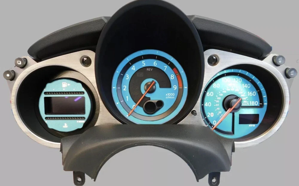 The product is a 3 MIL thick Instrument Cluster Overlay designed for a 2009-2020 Nissan 370Z. It includes a Speedometer with a Matte plastic vinyl finish. Made in the United States, the overlay features a Luminescent design on the color face gauges. Message which color after purchase!