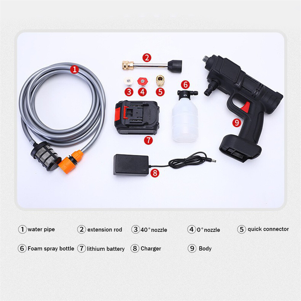 eBay Feature: 1. Long-lasting Battery Life: With a high-capacity lithium battery, this pressure washer boasts a maximum runtime of 80 minutes - perfect for tackling large cleaning jobs without needing a recharge. 2. Powerful Pressure: Equipped with an 18mm diameter plunger pump and an 18D piston pump, this pressure washer delivers strong water pressure with a range of up to 10 meters, making it good for outdoor cleaning tasks. 3. Versatile Nozzle: Featuring multiple water patterns that can be adjusted to suit different cleaning needs, this wireless pressure washer eliminates the need for power cords and can be used in a variety of settings, from outdoor patios to cars and boats. 4. Durable Motor: With a 3000W all-copper motor capable of reaching speeds of up to 20000rpm, this pressure washer is built to withstand extended use without overheating or burning out. 5. Flexible Usage: Its self-priming design, this pressure washer can be used with a variety of water sources, including buckets and bottles, and the nano double filtration system ensures clean water for optimal performance and longevity. Specification: Origin: China Product color: as shown in the picture Product Material: ABS+Hardware Product type: 10 Battery Cell Product plug: US Product voltage: 12V-21V Product power: 200W Product range: 60/80 points Water pressure: 50BAR Apex: 70BAR Spray distance: 7-10 meters 1 x High pressure water gun 1 x Battery 1 x Quick connector 1 x 5-meter explosion-proof tube 1 x Filter screen 1 x Long rod joint 2 x Spray nozzle 1 x Water gun Note: Due to the different monitor and light effect, the actual color of the item might be slightly different from the color showed on the pictures. Thank you! Please allow 1-2cm measuring deviation due to manual measurement.