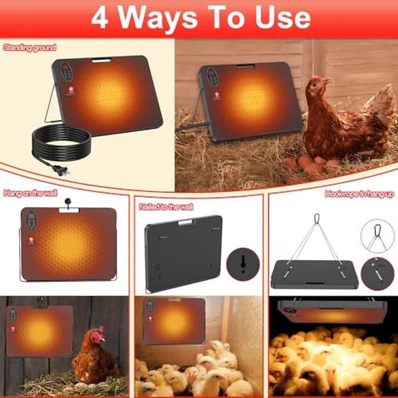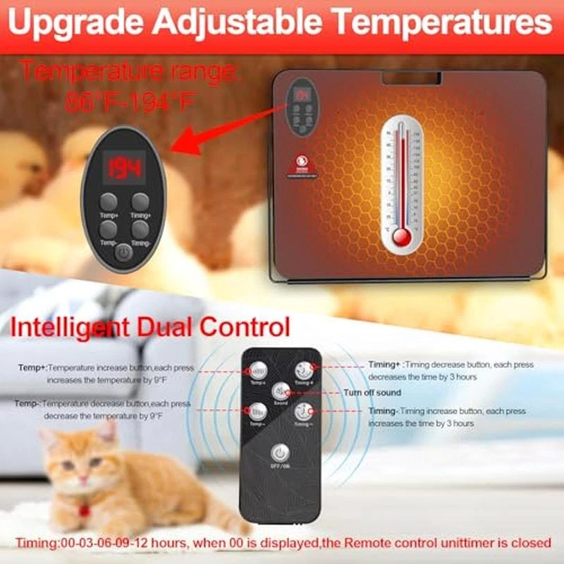 You may also like 9000 BTU Liquid Propane Heater Portable Emergency Heat Camping Hunting Outdoor 89.67 USD 94.39 USD Free shipping 5% off Ceiling Mounted Electric Heater 1500W Quartz Radiant W/ Work Light 5 Settings US 78.36 USD 82.48 USD Free shipping 5% off 1500W Space Heater Ceramic Remote Quiet Auto-off Timer Widespre Oscillation New 80.7 USD 84.95 USD Free shipping 5% off Double Tank Connection Kit W/ 30in Hose Brass Tee Bulk Tank Applications New 53.44 USD 56.25 USD Free shipping 5% off About this item 【2024 Upgraded Thermostatic Chicken Coop Heater】 Our safe energy efficient graphene radiant heating Plate has a built-in graphene heating plate, which heats up quickly and evenly, providing gentle radiant heat for chickens, cats, dogs and other animals, safer and more environmentally friendly, equipped with a smart thermostat control chip and temperature sensor, the gentle heat is perfect for keeping pets comfortable and warm, ensuring your pets and poultry get reliable warmth in the winter. 【Safety & Energy Saving】The pet house heater has overheating protection and energy-saving design, the heating plate wire meets ETL standards, UL standards, low fire risk, built-in electrical safety protection device, overheating protection design, to ensure the safety of pets or live animals. The energy-efficient heater is more energy-efficient than traditional heaters, with a maximum power of only 200w. Provide warmth and safety for your pets while reducing your living costs. 【Temperature Adjustment & Timing Levels】 Our flat-panel radiant heater has 13 temperature levels (86℉ - 194℉) and 5 timing levels (0-3-6-9-12H) to adjust the temperature and time by the button on the heater. The effective radiant heat range is within 16 inches (40 cm). The thermal sticker will remind you of the temperature status. This sticker is black for temperatures below 113℉ (45℃), and red for temperatures above 113℉ (45℃). Perfect for outdoor chicken coops and cold winter temperatures. 【4 Installation Methods 】The radiant heater is easy to use and install, and the angle can be adjusted at any angle from 30-150 degrees, thus ensuring full warmth from all angles to meet different needs. Four options are suitable for different scenarios: vertical, wall-mounted, nailed to the wall, and hanging. Equipped with required accessories: vertical feet, 3 screws, and 4 slings. It also comes with a 9. 8-foot/3-meter long anti-bite line. The included remote control makes operation simple. 【Great for Pets Small Animals 】The chicken coop heater is suitable for indoor chicken coops and cold winter temperatures,and provides continuous and gentle heat without overheating your dog,cat or other animal's habitat, which can eliminate the risk of fire and burns, ensuring a safe indoor heating solution. This heater is sturdy and durable. The pet house heater is ideal for different growth stages of pets or chicks. (Warm Tips: This product is only for local heating and cannot heat large areas) Brand:TLXLT Target Species:Chicken Product Dimensions:16"L x 12"W x 1. 3"H Material:Polyester Specific Uses For Product:Indoor You may also like 40 Degree Rectangular Sleeping Bag Warm Weather Extra Long Adult 80"x36" Blue US 38.35 USD 40.37 USD Free shipping 5% off 10' x 10' Top Replacement Cover Outdoor Canopy Fishing Tailgating Camping Red US 51.14 USD 53.83 USD Free shipping 5% off 2-In-1 Rotary Cultivator Tool Adjustable Length Garden Hand Tiller Weeder Patio 41.03 USD 43.19 USD Free shipping 5% off 1000W 1.1 Cu Ft Countertop Microwave Oven Sensor Cooking Stainless Steel Kitchen 136.8 USD 144.0 USD Free shipping 5% off Wide Walk Through Pet Gate W/Small Pet Door Expandable Pressure Mount Kit Sturdy 43.51 USD 45.8 USD Free shipping 5% off Tactical Hard Pistol Revolver Case DIY Foam TSA Approved 13.3*8.2*4.3 inches New 52.43 USD 55.19 USD Free shipping 5% off Rolling Multi-Use Cart Shopping Cart Adjustable Handle Height Durable Steel New 44.75 USD 47.1 USD Free shipping 5% off 62 Qt Hard Chest Wheeled Cooler Cup Holders Backyard Camping Beach Tailgate Blue 75.57 USD 79.55 USD Free shipping 5% off Ceiling Mounted Electric Heater 1500W Quartz Radiant W/ Work Light 5 Settings US 78.36 USD 82.48 USD Free shipping 5% off Cold Press Juicer Masticating Machine Large Feed Chute High Yield Kitchen Home 94.03 USD 98.98 USD Free shipping 5% off Rolling Tool Chest Service Cart 7 Drawer Organizer Storage Heavy Duty Garage New 300.29 USD Free shipping 45 Servings Potato Gems Complete Mashed Potatoes Storage Camping Survival Pantry 26.86 USD 28.27 USD Free shipping 5% off