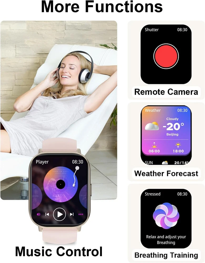 【2.01” HD Screen & 100 Watch Faces】The fitness tracker watch is equipped with a large 2.01-inch HD colorful screen, delivering exceptional picture quality and highly responsive touch sensitivity. Express yourself with an collection of over 100 watch faces, or you can also personalize the watch face by selecting your favorite photo. 【Al Voice Control & Bluetooth Calling】Work with Al Voice assistant, you can ask questions, control music playback, check the weather, set alarms and timers, and more by speaking to your watch. With Bluetooth 5.2, you can also answer/make clear calls directly from your smart watches when your phone is out of reach. (THE WATCH CAN NOT SEND MESSAGES, or TEXT BACK, Bluetooth distance 8-10 meters). 【24/7 Accurate Health Monitoring】This fitness watch will continously records your daily steps, distance, calorie consumption. Also it features advanced sensors to monitor heart rate, blood oxygen levels, stress levels & sleep tracking. All recorded data can be synced to your phone for analysis, providing valuable insights into your health and facilitating lifestyle adjustments. 【120+ Sports Modes & IP67 Waterproof】The Fitoncloud sports watch supports over 120 sports modes, including Running, Walking, Hiking, Badminton, Boating, Climbing, Cycling, Fitness, Swimming, Yoga & More. This smart watch allows you to accurately track your exercise time and calories burned, aiding in maintaining a healthy balance between activity and rest. It boasts an IP67 waterproof rating, ensuring worry-free use even while washing hands, face, or engaging in sweaty activities 【Message Notification & Powerful】Stay connected to SMS and app messages from Text, Facebook, WhatsApp, Instagram, X, Telegram, Tiktok, Skype and more. Our fitness watch also contains many useful tools, such as Bluetooth answer/make call, Medication reminders, Cycle Tracking, Weather forecast, Music control, Camera control, Setting alarms, Stopwatch, Timer, Breather guide, Raise to wake, Find phone and so on. 【Widely Compatible & Long-Battery Life】Work seemlessly with iOS or Android smartphones (Compatible with iOS 9.0 or above, Android 5.0 or above). Including but not limited to iPhone 6~iPhone 15, Samsung, Google pixel Nexus, Microsoft, Huawei, Xiaomi HTC and More. With 2 hours of full charging time, it can last 3 days with typical use or 25 days’ standby 【Unlimited Experience】If you encounter any issues, please feel free to contact our customer service representatives through Amazon. We are here to assist you year-round. Product Description A Sporty ,Versatile and Comfortable Smartwatch for Men and Women A great gift! A sporty, Beautiful smart watch with great features. It's a great gift for families, friends. You can listen to music, call and receive calls. You can get text alerts and alerts from all my email and social media accounts. Health Monitoring: Tracks your sleep, heart rate, blood pressure and more. Facilitates your daily life, they have become a part of you! It tracks multiple sports modes accurately, including running, cycling, and yoga, while also monitoring heart rate, steps, and calories all day.