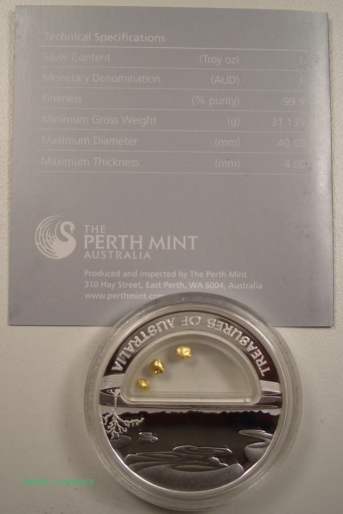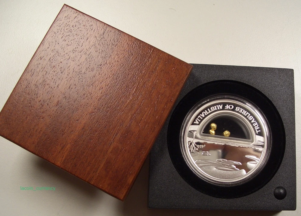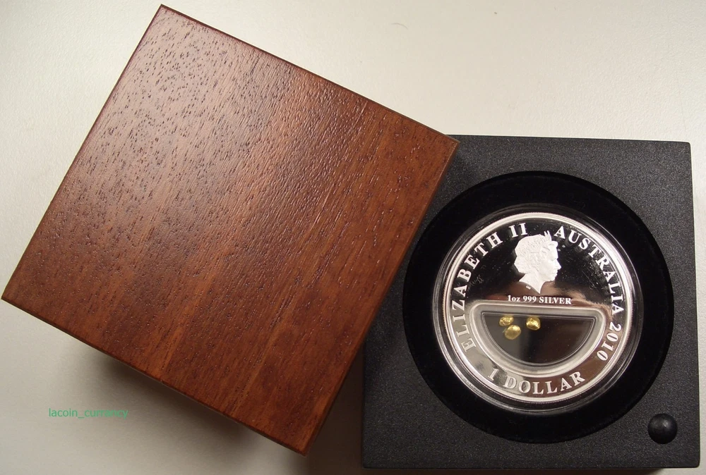 HERE YOU HAVE A 2010 TREASURES OF AUSTRALIA "GOLD" 1oz. SILVER COIN WITH REAL GOLD !!! A GREAT GIFT FOR ANY OCCASION !!! !!! HIGHLY COLLECTIBLE !!! YOU ARE BIDDING ON A 2010 TREASURES OF AUSTRALIA "GOLD" 1 oz. SILVER COIN WITH REAL GOLD THE COIN ALSO INCORPORATES A TRANSPARENT LOCKET CONTAINING 3 GRANULES OF PURE AUSTRALIAN GOLD WEIGHING A MINIMUM OF 0.50 g. ORIGINAL BOX AND COA INCLUDED THE COIN IN THE PICTURES IS THE COIN YOU WILL RECEIVE PLEASE LOOK AT THE PICTURES AND BID ACCORDINGLY PAYMENT IS DUE WITHIN 2 DAYS AFTER THE END OF THIS AUCTION. ALL PAYMENT OPTIONS ARE ACCEPTED. PLEASE INQUIRE. THANK YOU FOR YOUR BIDS. ENJOY AND HAVE FUN. View My Other Items For Sale Add me to your Favorite Sellers