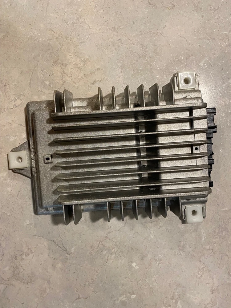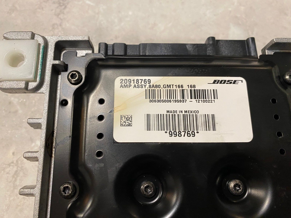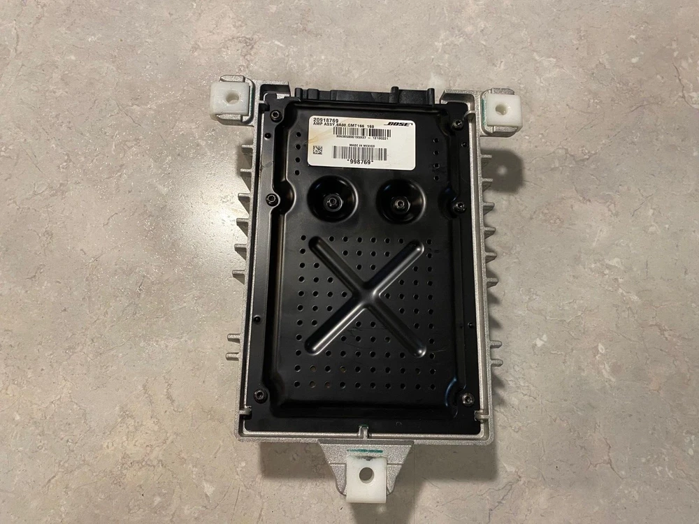 This is a OEM left side aluminum Bose amplifier (part number 20918769) for a 2010-2012 Cadillac SRX. It is a direct replacement for the original audio radio stereo amplifier in the vehicle, with a 1-month manufacturer warranty. The amplifier is designed specifically for the Cadillac SRX model and is not a universal fitment. Mounting hardware is not included, and it is a genuine OEM part.