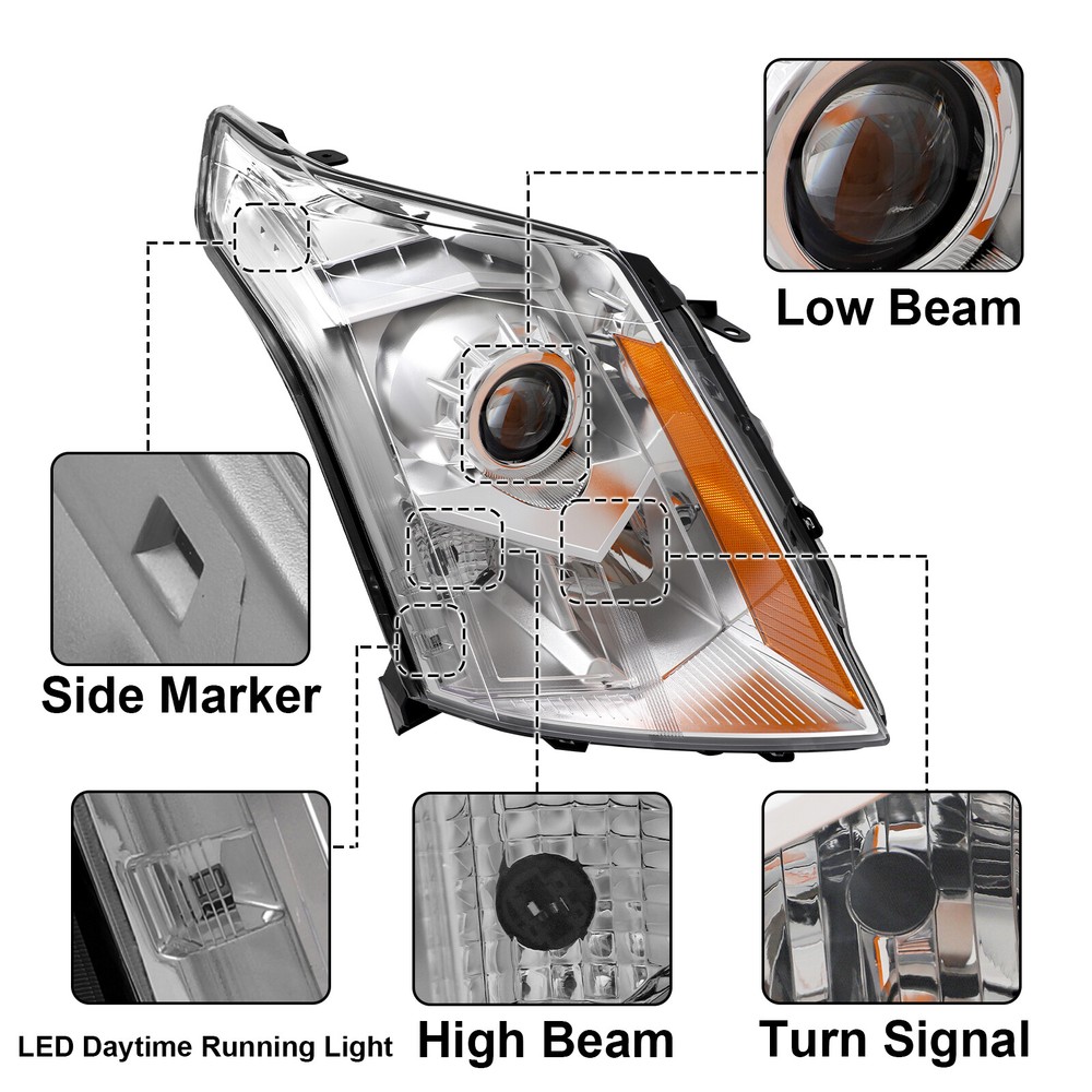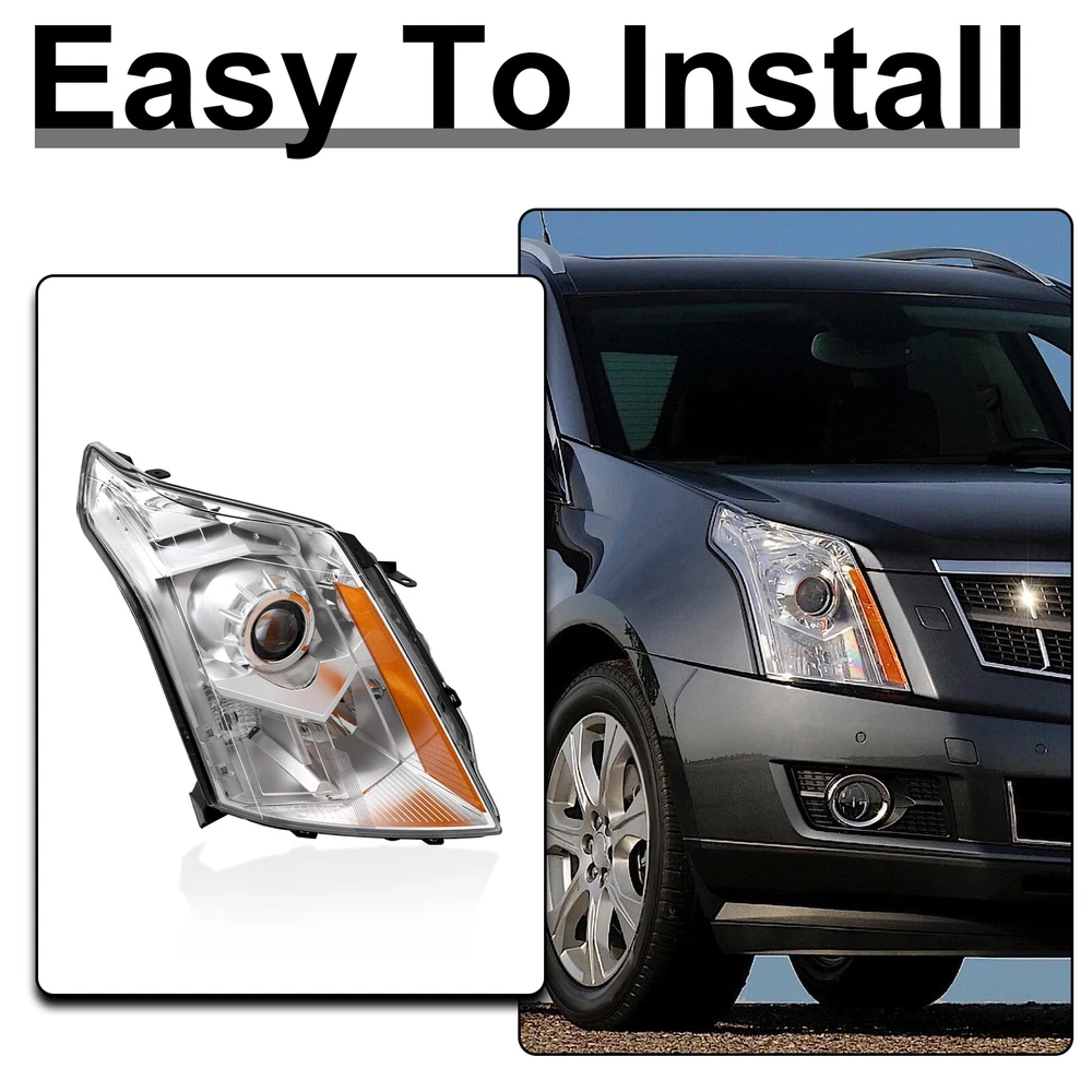 Headlight For 2010-2016 Cadillac SRX Halogen Projector Passenger Right Side Features: 1.Direct replacement for stock assemblies 2.Comes in pairs with driver & passenger sides (right) 3.DOT and SAE compliant with quality meeting or exceeding OEM units 4.All Headlight Lenses come with anti-yellowing/ageing coating 5.3-Months limited warranty 6.Increase your visibility during heavy rain, snow, dense fog and night time driving. Product Description: Material: ABS Plastic+ Polycarbonate Lens Placement on Vehicle: Front, Left, Right Bulbs Type : High Beam : 9005 (Bulbs not included) Low Beam :H11 (Bulbs not included) Housing Material: Plastic Lens Material: Plastic Chrome Housing Amber reflector Compatible with: CADILLAC 2010-2016 SRX 4-Door Sport Utility [ATTENTION: Compatible on Models w/ Factory Halogen Headlights Only] [ATTENTION: Not Compatible on Models on Performance and Premium Headlights] [ATTENTION: Not Compatible on Models w/ Factory HID or LED Headlights] Package includes: 1 headlight Passenger Right Side(Not included bulbs)