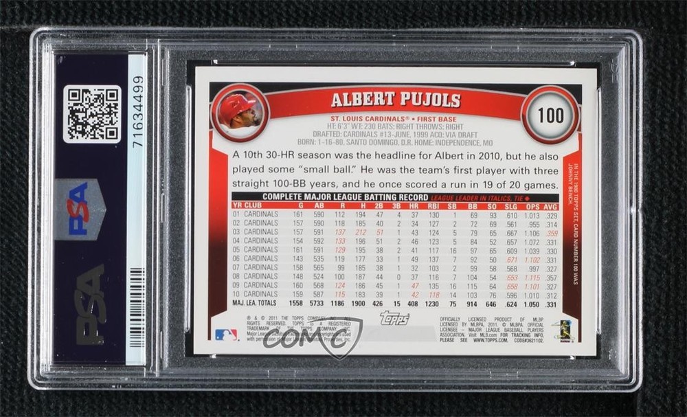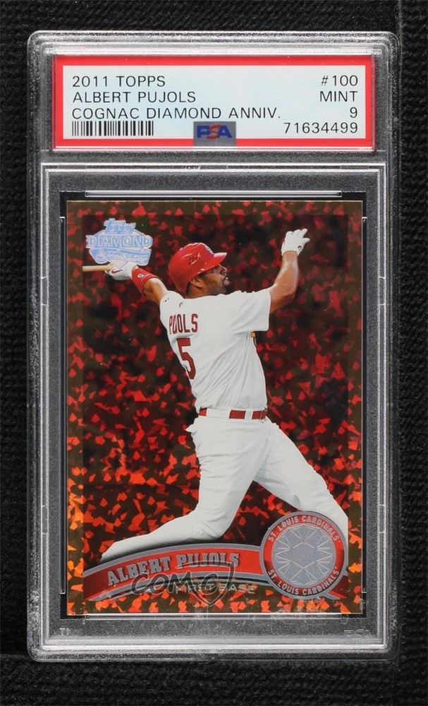 2011 Topps - [Base] - Cognac Diamond Anniversary #100.1 Albert Pujols Graded PSA 9 MINT - Baseball Card - Featuring the St. Louis Cardinals - Featuring Albert Pujols Search for more: 2011 Topps Search for more: 2011 Topps - [Base] - Cognac Diamond Anniversary View all of our Listings Auctions Buy It Now About Us Located in the beautiful Pacific Northwest, COMC (Check Out My Cards) is the world's largest consignment service for trading card singles. More than 10,000 people have used our consignment service to list over 50 million trading cards. Find out how we can help you consign your items on eBay by contacting us through eBay messaging. COMC -- "The Safe & Easy Way to Buy & Sell" Representative Image - Select Specific Item above to see image of actual item Representative Image - Select Specific Item above to see image of actual item Raw Condition for Modern Cards Unless otherwise noted, raw modern cards are listed in Near Mint-Mint condition or better. A NM-MT card appears to be Mint at first glance, but upon closer inspection, may exhibit some of the following: minor print defects (e.g. roller marks, print line, dimple), minor scratches, slight edge wear, and slight corner wear. Centering is clearly visible in the images provided and does not factor into our condition assessment. Raw Condition for Vintage Cards Unless otherwise noted, raw vintage cards are listed in Excellent condition or better. An EX card may exhibit some of the following: minor rounding of corners, surface wear, print defects, light scratches, and slight edge wear/chipping. Centering is clearly visible in the images provided and does not factor into our condition assessment. Domestic Shipping Combined shipping for multiple items is available. To receive combined shipping, please ensure all desired items are in your eBay shopping cart before proceeding to checkout. eBay limits orders to 40 items per order. We automatically combine multiple orders placed on the same day. If you place multiple orders on the same day, please contact us to request a refund of applicable shipping costs. Signature confirmation may be required on invoices over $400. All cards are protected and shipped securely. International Shipping COMC offers eBay's International Shipping (EIS) for international orders under $2,500* (see country exceptions below). All duties and import fees are paid at checkout; in the rare event that there are additional import fees upon delivery, these are borne by the buyer. EIS packages route through a shipping hub in Erlanger, KY before shipping to their final destination. Please note that EIS does not allow for combined shipments. The shipping rates are determined by eBay and cannot be adjusted. *Maximum sale price exceptions: Colombia, Kuwait ($2,000); Taiwan ($1,539); Chile, Costa Rica, Guatemala, Honduras, Trinidad and Tobago ($1,000); Antigua and Barbuda, Aruba, Belize, Dominica, Grenada, Philippines, Saint Kitts and Nevis, Saint Lucia, Montserrat, Turks and Caicos Islands ($500); Dominican Republic, El Salvador ($200). Please request a shipping quote through eBay messaging for orders that exceed the maximum sale price supported by eBay's International Shipping. You will be responsible for all duties and import fees for international orders shipped outside the EIS. All cards are protected and shipped securely. Payment COMC does not accept offers on our cards through our eBay storefront. COMC utilizes eBay’s managed payments system. If you are experiencing difficulties making a payment, please contact eBay for assistance. Return Policy Returns are only accepted on the rare occasion the item is not as described. If you are making a return, please initiate the return process through eBay so a mailing label can be provided for you. Prior to listing, our expert team carefully assessed this item to represent it accurately. Please review the description and high-definition images prior to purchasing to ensure this item meets your satisfaction. We welcome you to contact us if you have further questions about this item. Trust and Integrity COMC carefully assesses each item consigned to us to prevent fraudulent items from entering the marketplace. If you believe an item offered on COMC may be fraudulent, please contact us with details so we can investigate the issue. Items we determine are outside our supported items policy may be removed. Last Modified: 11/21/2025 4:15:45 AM PDT