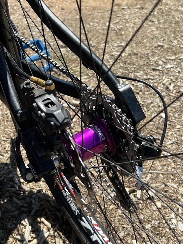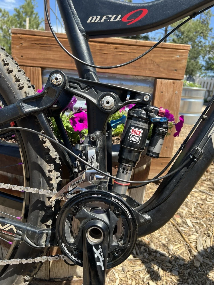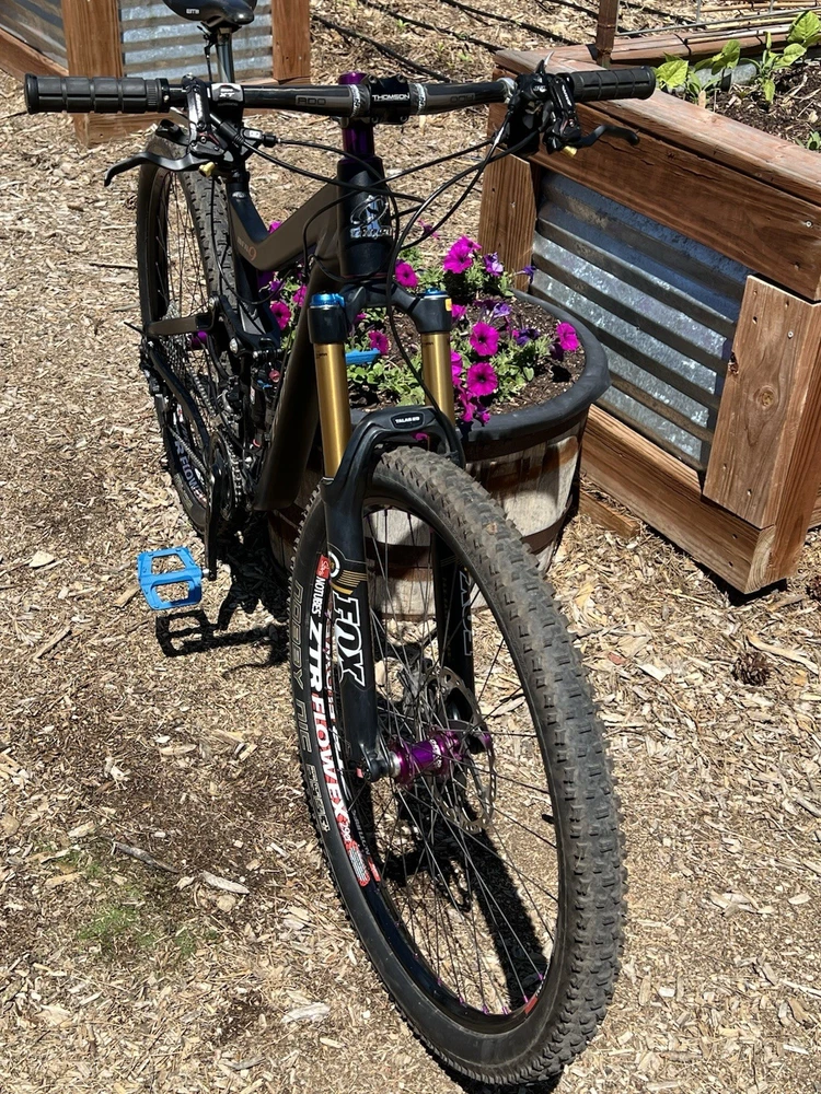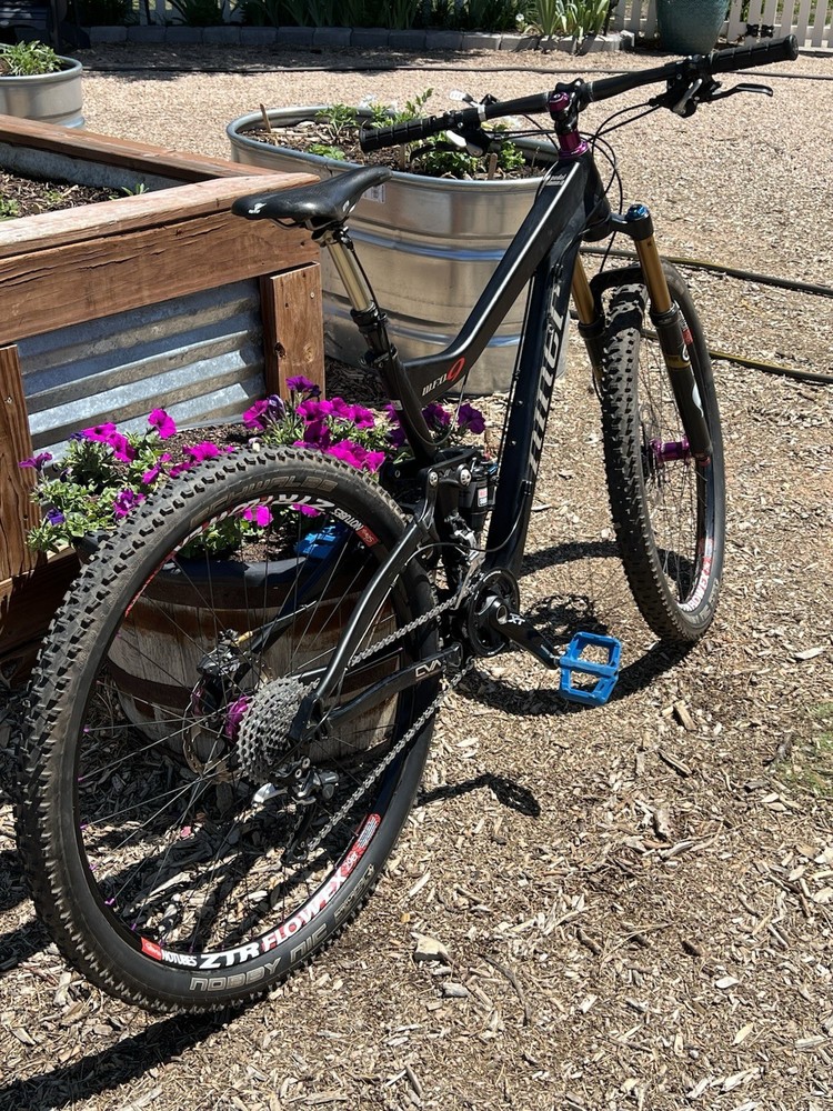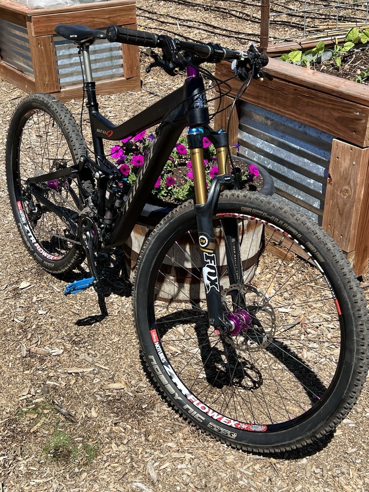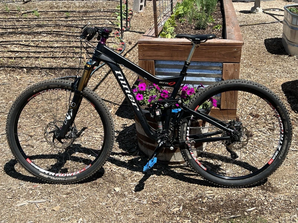 2012 Niner WFO size Medium with custom hand built wheels and custom spec. Very low miles because the owner wasn’t that into riding. Shimano Dynasis 2x10 speed with Wolf goat link and large cog. Tubeless tires will need fresh sealant but tires hold air. Seat post will need air before use. Shock and fork will need air before use. Drivetrain shifts great. Pedals and saddle are not included.