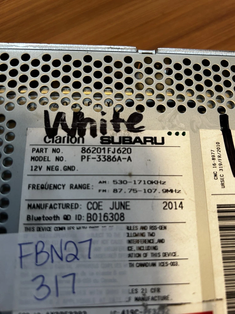 This Subaru Impreza AM/FM CD player radio receiver is a direct replacement for your dash. It is compatible with Subaru models from 2012-2014 and comes with an interchangeable part number of 638-59347. The manufacturer part number is 86201FJ630 This radio receiver does not include any mounting hardware and has not been modified. It is a reliable and functional addition to any Subaru Impreza and will provide high-quality sound for your listening pleasure. untested