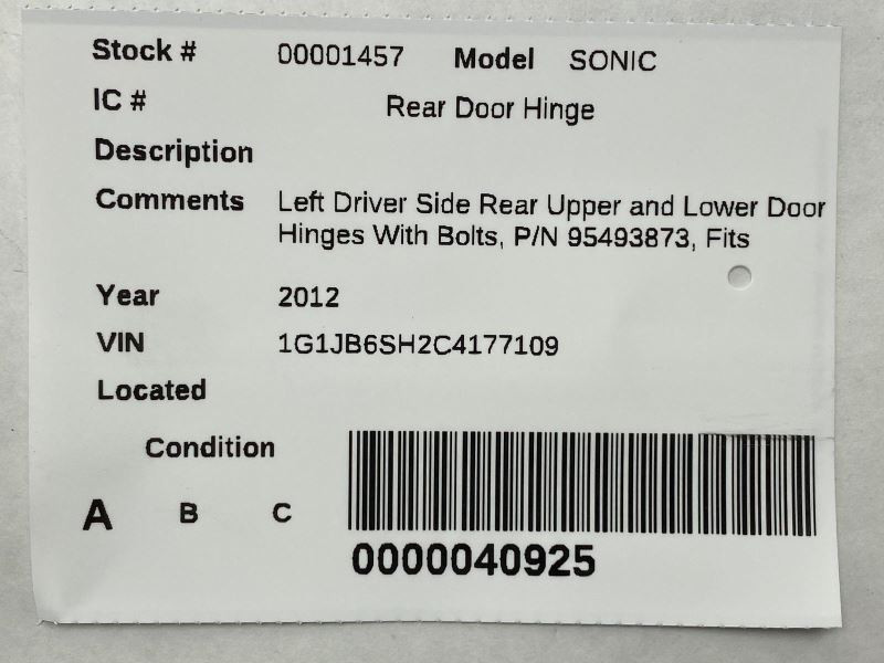 Hollander Welcome to our eBay store! Left Driver Side Rear Door Hinges With Bolt Fits 2012-2020 Chevrolet Sonic 83027 Description This listing is for a used Left Driver Side Rear Upper and Lower Door Hinges With Bolts. The part pictured is the actual item you will receive, no other parts are included. This part is used so normal wear is to be expected. Please see part fitment information below and please match part numbers before buying this item. If you have any questions please let us know. Donor Vehicle Model : SONIC Year : 2012 Mileage : 46000 (0 = not available or unknown) Stock Number : 001457 Notes : LEFT DRIVER SIDE REAR UPPER AND LOWE 031125 This Part Will Fit These Makes And Models With These Options About Us Payment Shipping Returns Warranty About Us Please contact us with any questions BEFORE purchasing. If you are unsure if this part will fit we are happy to verify fitment for you prior to purchase via your vehicle's VIN (Vehicle Identification Number). We try to answer all messages in 24 hours. Please note that orders are sent to the shipping department throughout the day therefore we cannot guarantee adjustments to orders after payment is received. Our hours of operation are: Monday - Friday 8:00AM - 5:00 PM CST Saturday - Sunday Closed Payment All orders must be paid in full prior to shipment. Payments are processed through eBay. We accept credit card and cash for Local Pickup orders. If payment is not received, an Unpaid Item case will be opened for the sake of seller fee reimbursement. Sales tax will be collected by eBay where applicable. Shipping We ship items via UPS, USPS, or LTL Freight Carriers. Tracking information is uploaded to the order once the item is shipped. Larger items such as Engines, Transmissions, Doors, Tailgates, Trunk Lids, Rear Axles etc. will ship via freight. Freight items are unable to be shipped until we have all the necessary information required by the carrier. Typically that includes a valid business name, address, valid phone number, and hours of operation. Be sure to provide us with all necessary contact information with your order as well. Freight charges are for zoned commercial addresses with a forklift or loading dock. If the location requires the assistance of a lift gate there will be an additonal fee. If a commercial address is not able to be provided we can ship the item to your residence for an additional fee. Add $100 for Residential delivery Add $85 for Liftgate delivery Most orders are shipped within one business day. If there is an issue with your order or item we will reach out to you before we ship the order. Once payment is received for a freight item we will send a message asking for additional information needed for the freight carrier. Without this information we will not be able to ship your item. If a USPS or UPS item is damaged during shipping please keep all packaging and loose parts complete with the package. Send us a message through Ebay with some pictures and your invoice number. We will work on getting a replacement item to you while handling the UPS claim as well. Please Inspect all freight shipments before signing for them at time of delivery! If there has been any damage to the item during shipping inspect the item to see if you can still use it or not. If you can still use the item, notate the damage on the delivery ticket that the driver is keeping then hand it back to them. Send us a message with a copy of your receipt and the delivery ticket you kept. We will take care of the damage claim with the freight carrier. If you cannot use the product simply decline the shipment send us a message and we will work on getting a replacement or refund to you. It is very important to not sign for any damaged product without notating it on the delivery ticket or denying the shipment. You have the right to inspect the package for obvious signs of damage prior to signing and accepting the delivery. If a delivery driver is refusing to let you inspect the shipment before you sign for it, do not sign, refuse the shipment and contact us through eBay messaging. When you sign for the delivery on the carrier's Bill Of Lading (BOL) it is accepting the merchandise as is and in good order. So please inspect your package before signing for it. We do understand that sometimes there will be damage that is missed, don’t worry we will still be able to help you. If you do find concealed damage after you sign for the package let us know through messages and send some pictures as well. We will get with the freight company and start a claim. We are not responsible for any delays incurred by the shipping company. No International shipping is available outside of the eBay Global Shipping program. We do not ship to PO Boxes, Hawaii, Alaska, Puerto Rico, APO, FPO, AA, AE, AP and U.S. Territories outside of the continental U.S. International orders are shipped via eBay’s Global Shipping Program. Customer pickup at our location is also available. Please contact us prior to your purchase to arrange pick up. Returns If you need to return an item for any reason please contact us first to obtain a RMA number (Return Material Authorization). All returns must be authorized by us before being shipped back. Any items returned must include an RMA number clearly written on the side of the packaging. If you are returning a part because you bought the wrong one or no longer need it the original shipping charges are not refunded and you are responsible for the return shipping. All returns must be made within 30 days of the date of purchase. All parts must be returned in their original condition to receive full credit Once you obtain an RMA number, ship the item back to: Frontier Auto Parts, 2199 Ranger Hwy, Weatherford, TX 76088 Warranty All parts we sell through eBay Motors come with a 30-day warranty and a 30 day return period unless otherwise stated. No labor warranty is provided. In the event a part sold with a warranty fails to operate within the wa