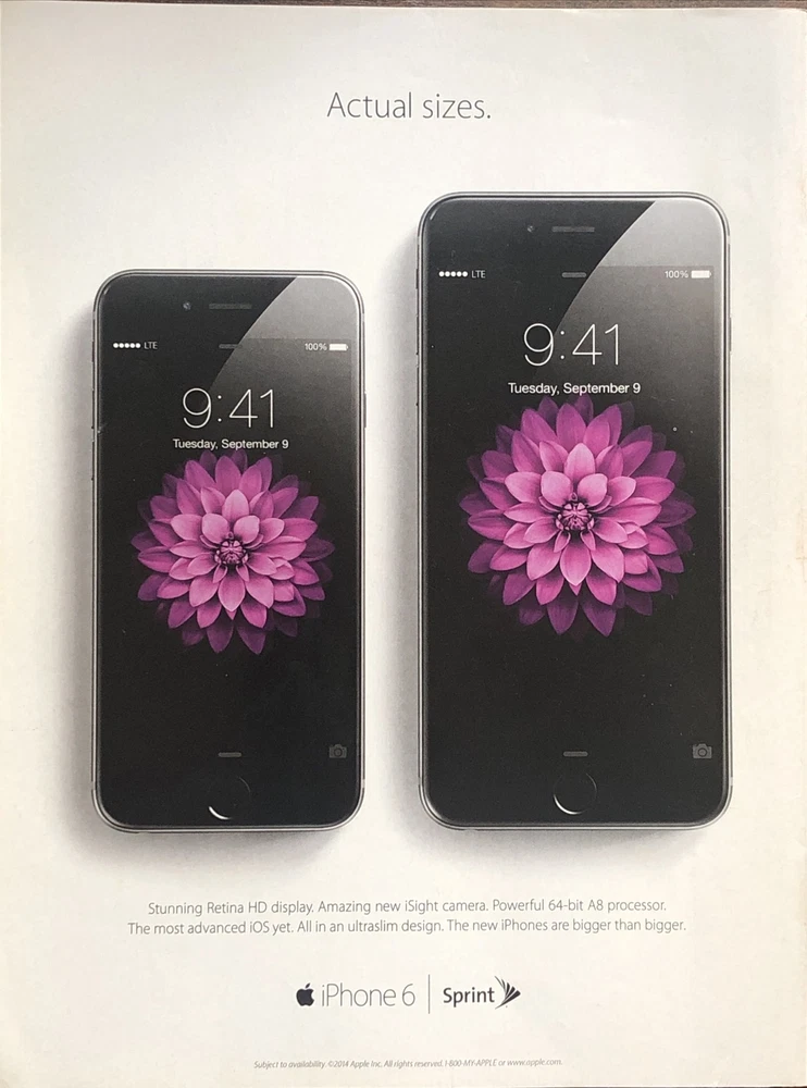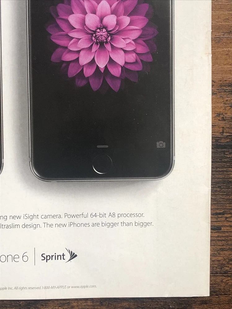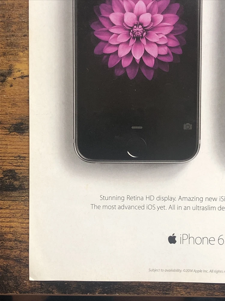 This 2014 Apple iPhone 6 PRINT AD is a rare collectible item for any advertising or technology enthusiast. The ad is a magazine print ad and was created in the United States. It is multi-colored and dates back to 2014. The brand is Apple and the type of advertising is magazine print ad. This item is a must-have for anyone interested in collecting advertising and technology memorabilia. Original approximate 8”x11” double sided magazine print ad.