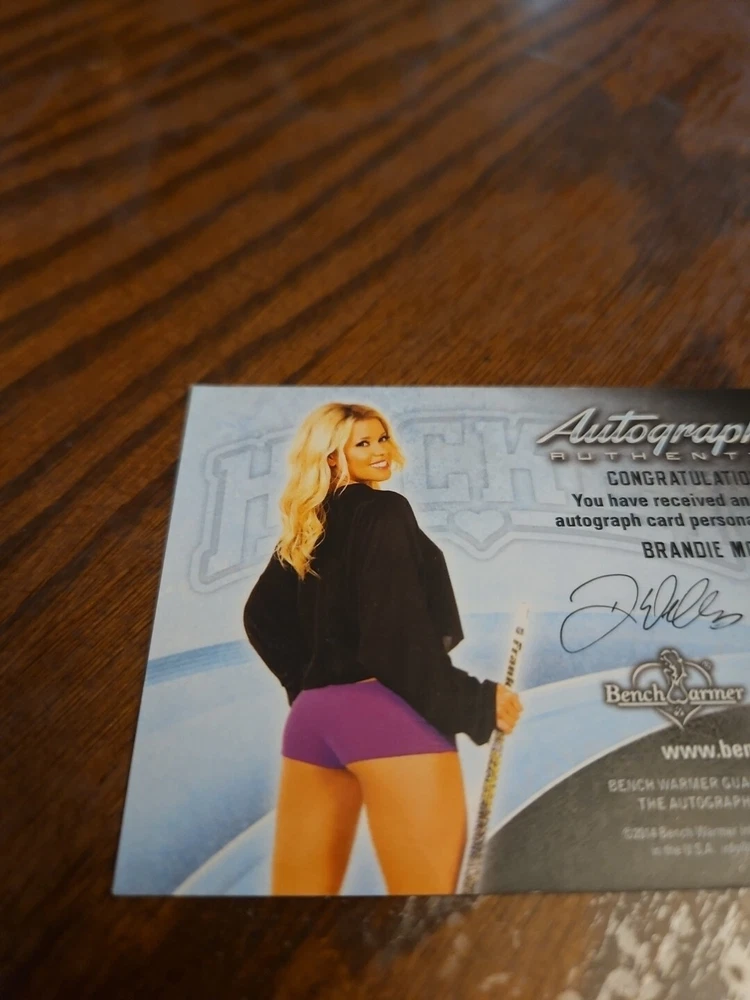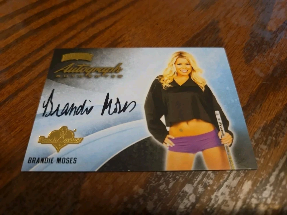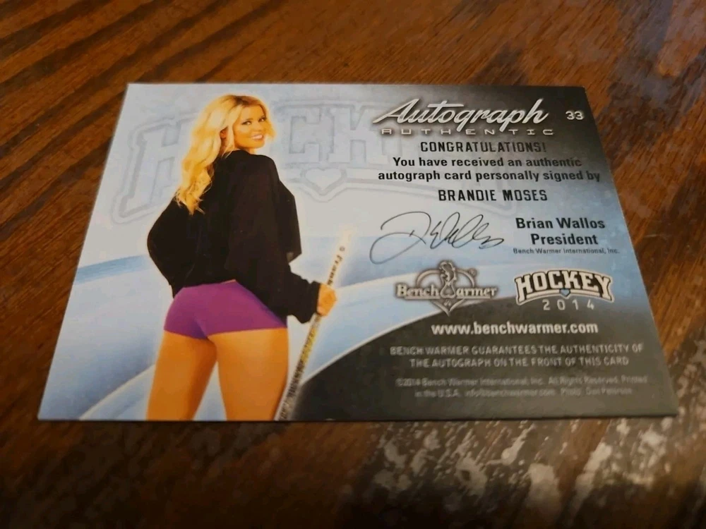 2014 Benchwarmer Hockey Autograph Gold Foil Card Brandie Moses #33 Auto Playboy Buxom and shapely 5'5' blonde bombshell Brandie Moses was born on July 19, 1979 in Corpus Christi, Texas. Moses first began modeling in 2004 and created her own line of beauty and bath products prior to becoming the Playboy Cybergirl of the Week for September 18, 2006. Moreover, Brandie not only has been featured in a handful of Playboy special editions, but also hosted several episodes of Playboy's Beach House (2010) . Outside of Playboy, Moses has also modeled for such notable clients as Mac & Bumble, Miller Lite Beer, Surfer Magazine, Sex Symbol Jeans, BenchWarmer Cards, Texas Girls Calendar, and Easy Rider Magazine. Please, look at all the pictures. Please check out my other eBay accounts... https://www.ebay.com/usr/kimmyrael https://www.ebay.com/usr/matlac99 https://www.ebay.com/usr/lacr6837 https://www.ebay.com/usr/malac9440 https://www.ebay.com/usr/lacr_3567 https://www.ebay.com/usr/lacroki8 https://www.ebay.com/usr/lacroki9 Shipping only to the continental US unless you contact me first. Will combine shipping!!!