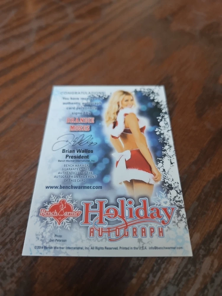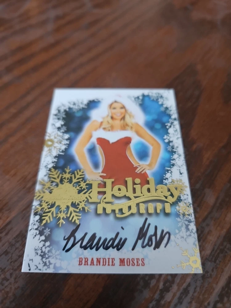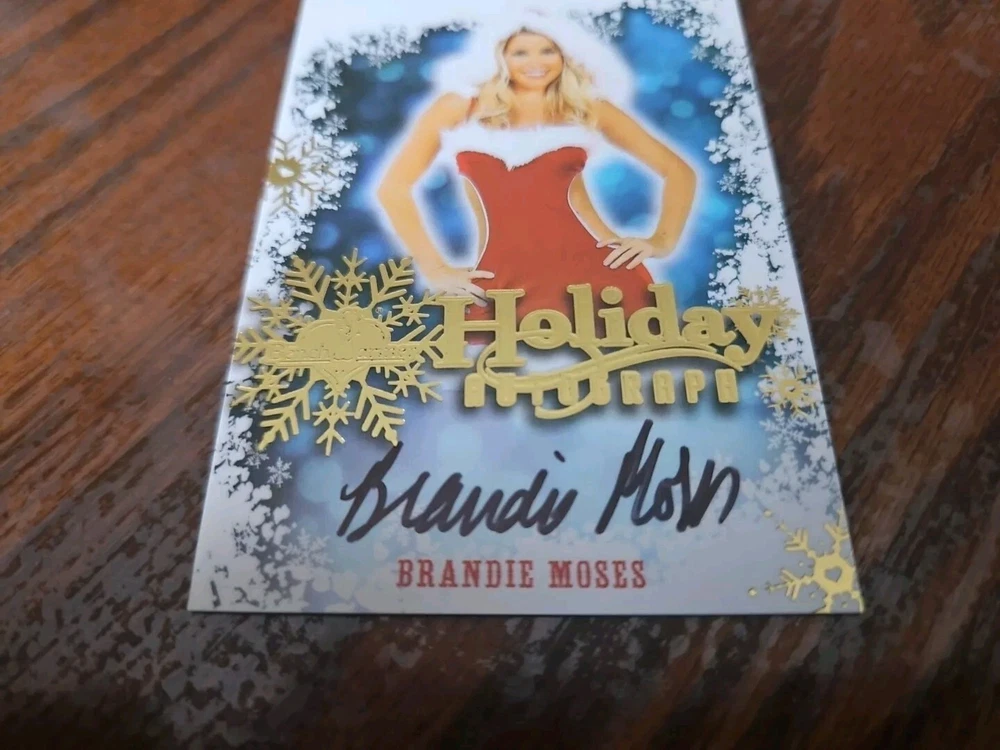 2014 Benchwarmer Holiday Autograph Gold Foil Card Brandie Moses Auto Playboy Buxom and shapely 5'5' blonde bombshell Brandie Moses was born on July 19, 1979 in Corpus Christi, Texas. Moses first began modeling in 2004 and created her own line of beauty and bath products prior to becoming the Playboy Cybergirl of the Week for September 18, 2006. Moreover, Brandie not only has been featured in a handful of Playboy special editions, but also hosted several episodes of Playboy's Beach House (2010) . Outside of Playboy, Moses has also modeled for such notable clients as Mac & Bumble, Miller Lite Beer, Surfer Magazine, Sex Symbol Jeans, BenchWarmer Cards, Texas Girls Calendar, and Easy Rider Magazine. Please, look at all the pictures. Please check out my other eBay accounts... https://www.ebay.com/usr/kimmyrael https://www.ebay.com/usr/matlac99 https://www.ebay.com/usr/lacr6837 https://www.ebay.com/usr/malac9440 https://www.ebay.com/usr/lacr_3567 https://www.ebay.com/usr/lacroki8 https://www.ebay.com/usr/lacroki9 Shipping only to the continental US unless you contact me first. Will combine shipping!!!