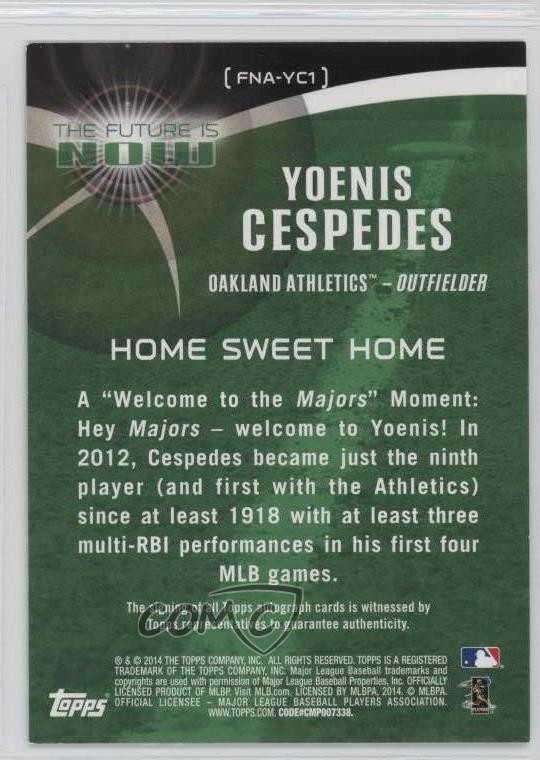 2014 Topps - The Future is Now - Autographs #FNA-YC1 Yoenis Cespedes Qty Made: 25 - Baseball Card - Featuring the Oakland Athletics - Featuring Yoenis Cespedes Search for more: 2014 Topps Search for more: 2014 Topps - The Future is Now - Autographs View all of our Listings Auctions Buy It Now About Us Located in the beautiful Pacific Northwest, COMC (Check Out My Cards) is the world's largest consignment service for trading card singles. More than 10,000 people have used our consignment service to list over 50 million trading cards. Find out how we can help you consign your items on eBay by contacting us through eBay messaging. COMC -- "The Safe & Easy Way to Buy & Sell" Representative Image - Select Specific Item above to see image of actual item Representative Image - Select Specific Item above to see image of actual item Raw Condition for Modern Cards Unless otherwise noted, raw modern cards are listed in Near Mint-Mint condition or better. A NM-MT card appears to be Mint at first glance, but upon closer inspection, may exhibit some of the following: minor print defects (e.g. roller marks, print line, dimple), minor scratches, slight edge wear, and slight corner wear. Centering is clearly visible in the images provided and does not factor into our condition assessment. Raw Condition for Vintage Cards Unless otherwise noted, raw vintage cards are listed in Excellent condition or better. An EX card may exhibit some of the following: minor rounding of corners, surface wear, print defects, light scratches, and slight edge wear/chipping. Centering is clearly visible in the images provided and does not factor into our condition assessment. Domestic Shipping Combined shipping for multiple items is available. To receive combined shipping, please ensure all desired items are in your eBay shopping cart before proceeding to checkout. eBay limits orders to 40 items per order. We automatically combine multiple orders placed on the same day. If you place multiple orders on the same day, please contact us to request a refund of applicable shipping costs. Signature confirmation may be required on invoices over $400. All cards are protected and shipped securely. International Shipping COMC offers eBay's International Shipping (EIS) for international orders under $2,500* (see country exceptions below). All duties and import fees are paid at checkout; in the rare event that there are additional import fees upon delivery, these are borne by the buyer. EIS packages route through a shipping hub in Erlanger, KY before shipping to their final destination. Please note that EIS does not allow for combined shipments. The shipping rates are determined by eBay and cannot be adjusted. *Maximum sale price exceptions: Colombia, Kuwait ($2,000); Taiwan ($1,539); Chile, Costa Rica, Guatemala, Honduras, Trinidad and Tobago ($1,000); Antigua and Barbuda, Aruba, Belize, Dominica, Grenada, Philippines, Saint Kitts and Nevis, Saint Lucia, Montserrat, Turks and Caicos Islands ($500); Dominican Republic, El Salvador ($200). Please request a shipping quote through eBay messaging for orders that exceed the maximum sale price supported by eBay's International Shipping. You will be responsible for all duties and import fees for international orders shipped outside the EIS. All cards are protected and shipped securely. Payment COMC does not accept offers on our cards through our eBay storefront. COMC utilizes eBay’s managed payments system. If you are experiencing difficulties making a payment, please contact eBay for assistance. Return Policy Returns are only accepted on the rare occasion the item is not as described. If you are making a return, please initiate the return process through eBay so a mailing label can be provided for you. Prior to listing, our expert team carefully assessed this item to represent it accurately. Please review the description and high-definition images prior to purchasing to ensure this item meets your satisfaction. We welcome you to contact us if you have further questions about this item. Trust and Integrity COMC carefully assesses each item consigned to us to prevent fraudulent items from entering the marketplace. If you believe an item offered on COMC may be fraudulent, please contact us with details so we can investigate the issue. Items we determine are outside our supported items policy may be removed. Last Modified: 11/20/2025 9:52:28 PM PDT
