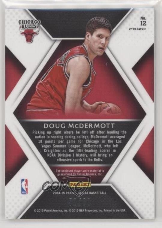 2014-15 Panini Select - Rookie Swatches - Orange Prizm #12 Doug McDermott Qty Made: 60 - Rookie - Basketball Card - Featuring the Chicago Bulls - Featuring Doug McDermott Search for more: 2014-15 Panini Select Search for more: 2014-15 Panini Select - Rookie Swatches - Orange Prizm View all of our Listings Auctions Buy It Now About Us Located in the beautiful Pacific Northwest, COMC (Check Out My Cards) is the world's largest consignment service for trading card singles. More than 10,000 people have used our consignment service to list over 50 million trading cards. Find out how we can help you consign your items on eBay by contacting us through eBay messaging. COMC -- "The Safe & Easy Way to Buy & Sell" Representative Image - Select Specific Item above to see image of actual item Representative Image - Select Specific Item above to see image of actual item Raw Condition for Modern Cards Unless otherwise noted, raw modern cards are listed in Near Mint-Mint condition or better. A NM-MT card appears to be Mint at first glance, but upon closer inspection, may exhibit some of the following: minor print defects (e.g. roller marks, print line, dimple), minor scratches, slight edge wear, and slight corner wear. Centering is clearly visible in the images provided and does not factor into our condition assessment. Raw Condition for Vintage Cards Unless otherwise noted, raw vintage cards are listed in Excellent condition or better. An EX card may exhibit some of the following: minor rounding of corners, surface wear, print defects, light scratches, and slight edge wear/chipping. Centering is clearly visible in the images provided and does not factor into our condition assessment. Domestic Shipping Combined shipping for multiple items is available. To receive combined shipping, please ensure all desired items are in your eBay shopping cart before proceeding to checkout. eBay limits orders to 40 items per order. We automatically combine multiple orders placed on the same day. If you place multiple orders on the same day, please contact us to request a refund of applicable shipping costs. Signature confirmation may be required on invoices over $400. All cards are protected and shipped securely. International Shipping COMC offers eBay's International Shipping (EIS) for international orders under $2,500* (see country exceptions below). All duties and import fees are paid at checkout; in the rare event that there are additional import fees upon delivery, these are borne by the buyer. EIS packages route through a shipping hub in Erlanger, KY before shipping to their final destination. Please note that EIS does not allow for combined shipments. The shipping rates are determined by eBay and cannot be adjusted. *Maximum sale price exceptions: Colombia, Kuwait ($2,000); Taiwan ($1,539); Chile, Costa Rica, Guatemala, Honduras, Trinidad and Tobago ($1,000); Antigua and Barbuda, Aruba, Belize, Dominica, Grenada, Philippines, Saint Kitts and Nevis, Saint Lucia, Montserrat, Turks and Caicos Islands ($500); Dominican Republic, El Salvador ($200). Please request a shipping quote through eBay messaging for orders that exceed the maximum sale price supported by eBay's International Shipping. You will be responsible for all duties and import fees for international orders shipped outside the EIS. All cards are protected and shipped securely. Payment COMC does not accept offers on our cards through our eBay storefront. COMC utilizes eBay’s managed payments system. If you are experiencing difficulties making a payment, please contact eBay for assistance. Return Policy Returns are only accepted on the rare occasion the item is not as described. If you are making a return, please initiate the return process through eBay so a mailing label can be provided for you. Prior to listing, our expert team carefully assessed this item to represent it accurately. Please review the description and high-definition images prior to purchasing to ensure this item meets your satisfaction. We welcome you to contact us if you have further questions about this item. Trust and Integrity COMC carefully assesses each item consigned to us to prevent fraudulent items from entering the marketplace. If you believe an item offered on COMC may be fraudulent, please contact us with details so we can investigate the issue. Items we determine are outside our supported items policy may be removed. Last Modified: 11/20/2025 11:39:21 PM PDT