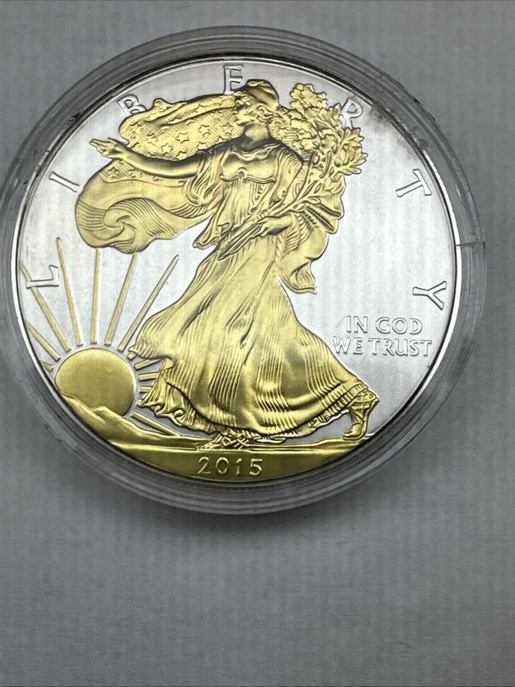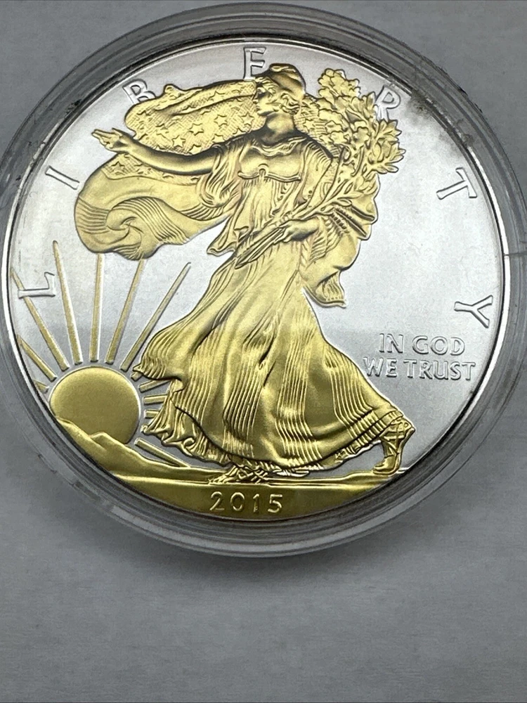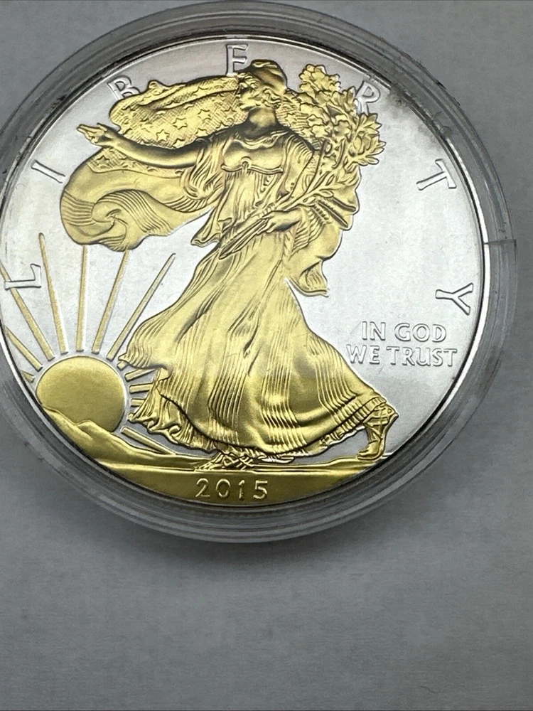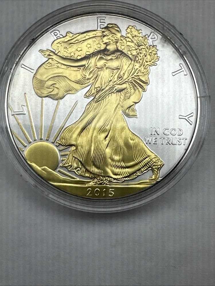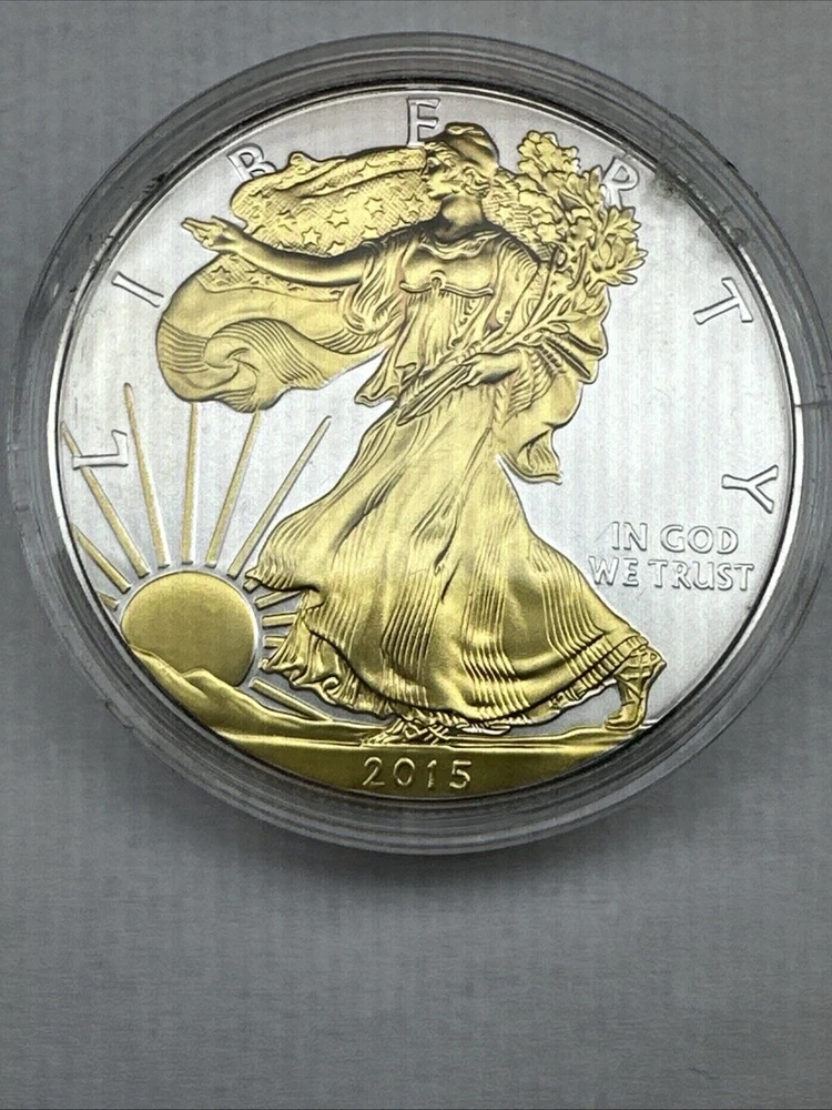 This is a 2015 American Silver Eagle coin, minted by the U.S. Mint. It contains 1 oz of 0.999 fine silver, with a gilded gold obverse design. The coin is uncertified and in uncirculated condition.