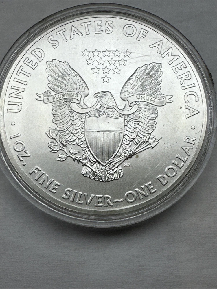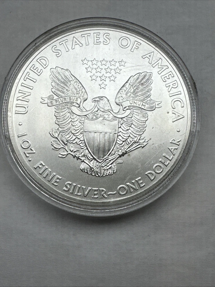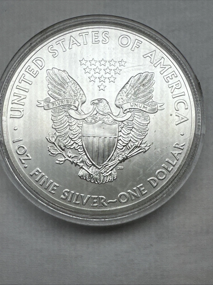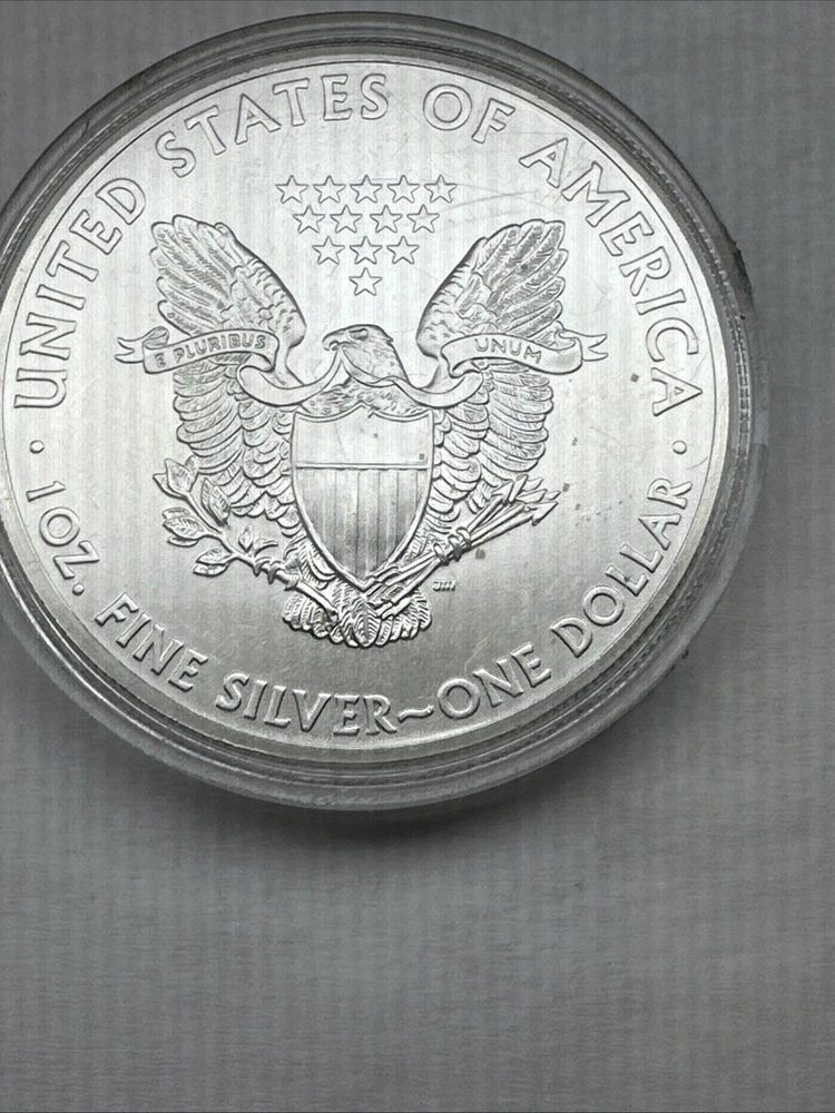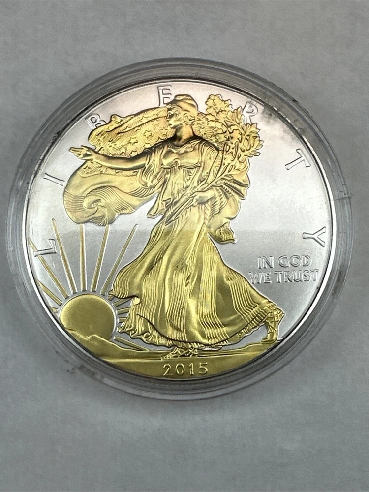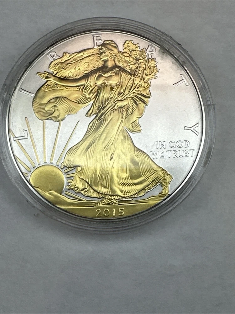 This is a 2015 American Silver Eagle coin, minted by the U.S. Mint. It contains 1 oz of 0.999 fine silver, with a gilded gold obverse design. The coin is uncertified and in uncirculated condition.
