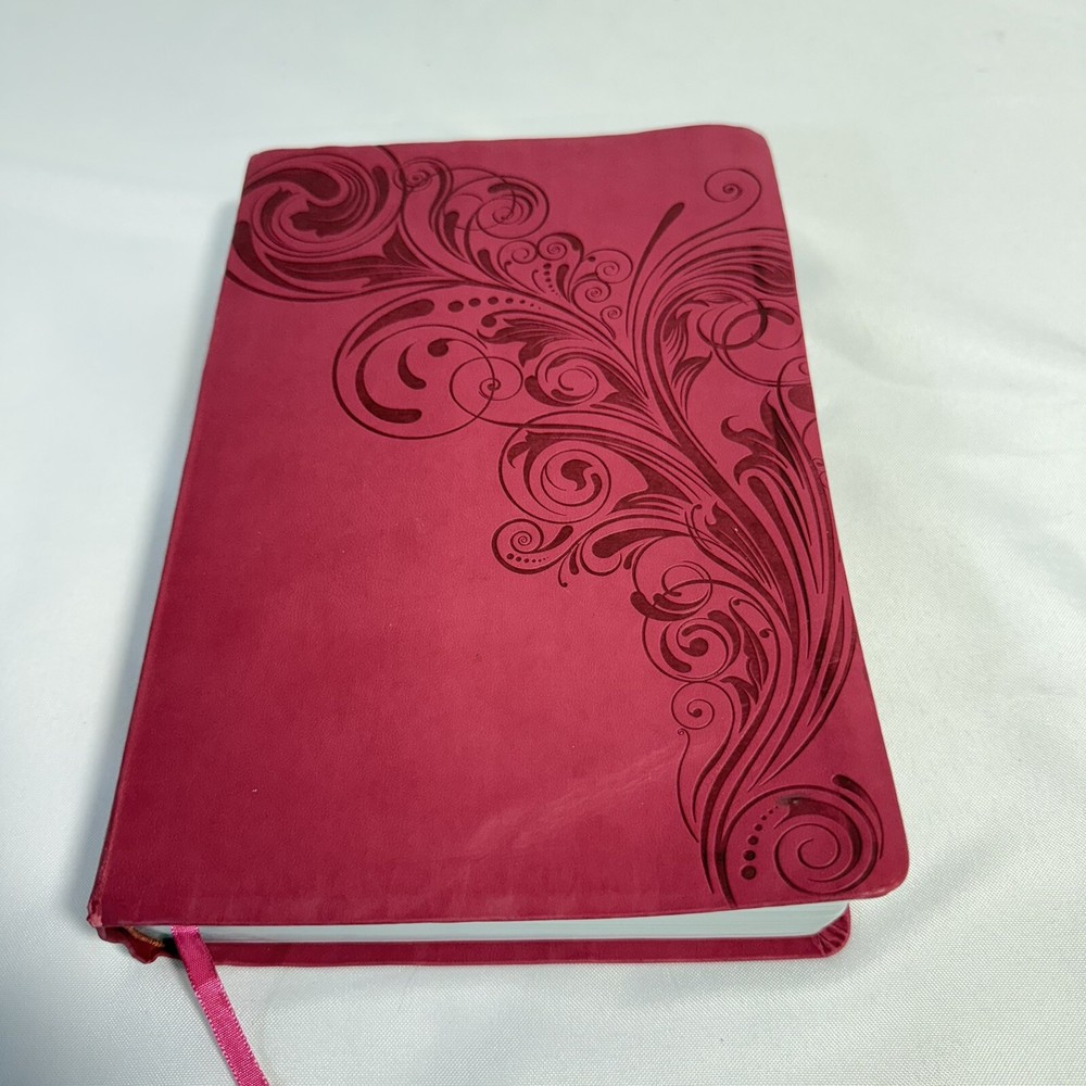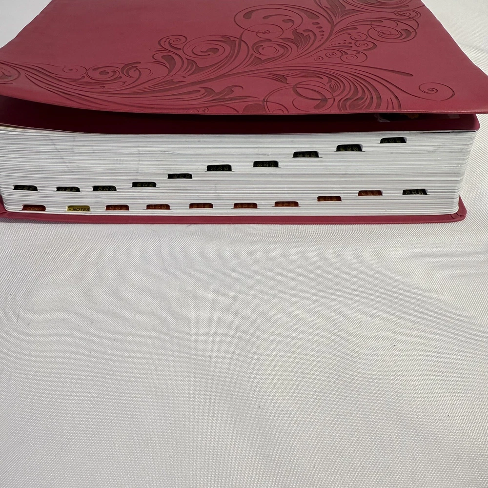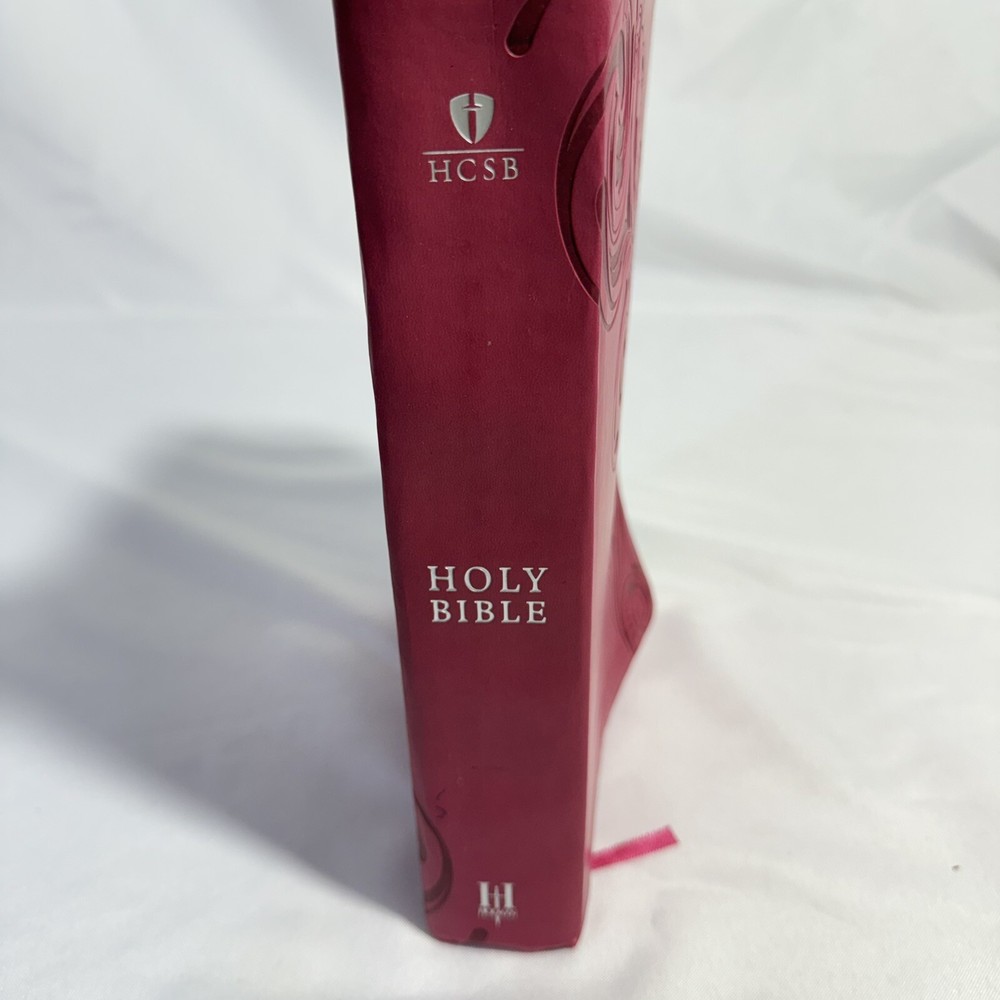 2015 Large Print Holman Christian Standard Bible Pink Leather Index Tabs Cover. Bible in great condition no writing or bent pages. Includes cover and built in index tabs. Does have one sticker from previous owner which can be removed. 10 1/2” long. 7 1/2” wide. 2” deep.