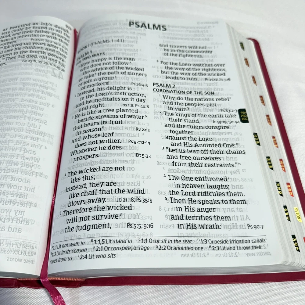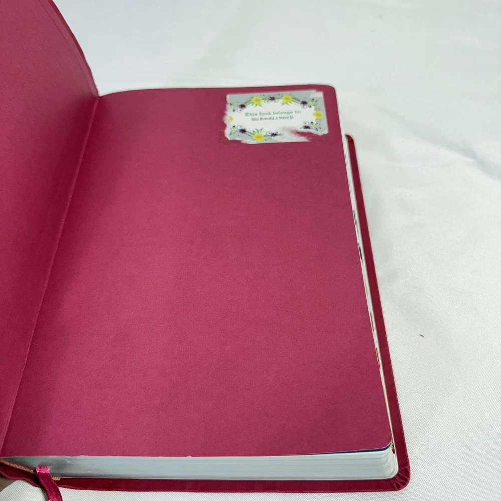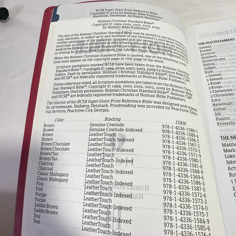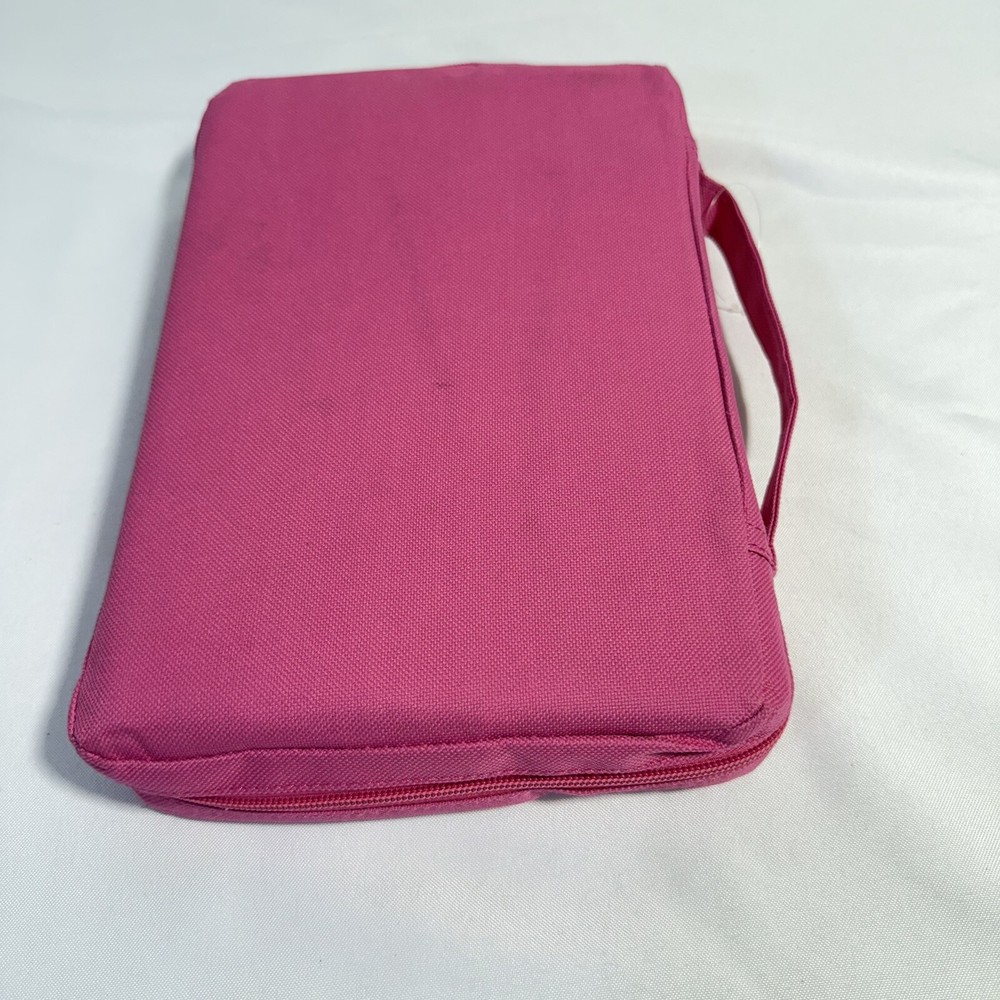2015 Large Print Holman Christian Standard Bible Pink Leather Index Tabs Cover. Bible in great condition no writing or bent pages. Includes cover and built in index tabs. Does have one sticker from previous owner which can be removed. 10 1/2” long. 7 1/2” wide. 2” deep.