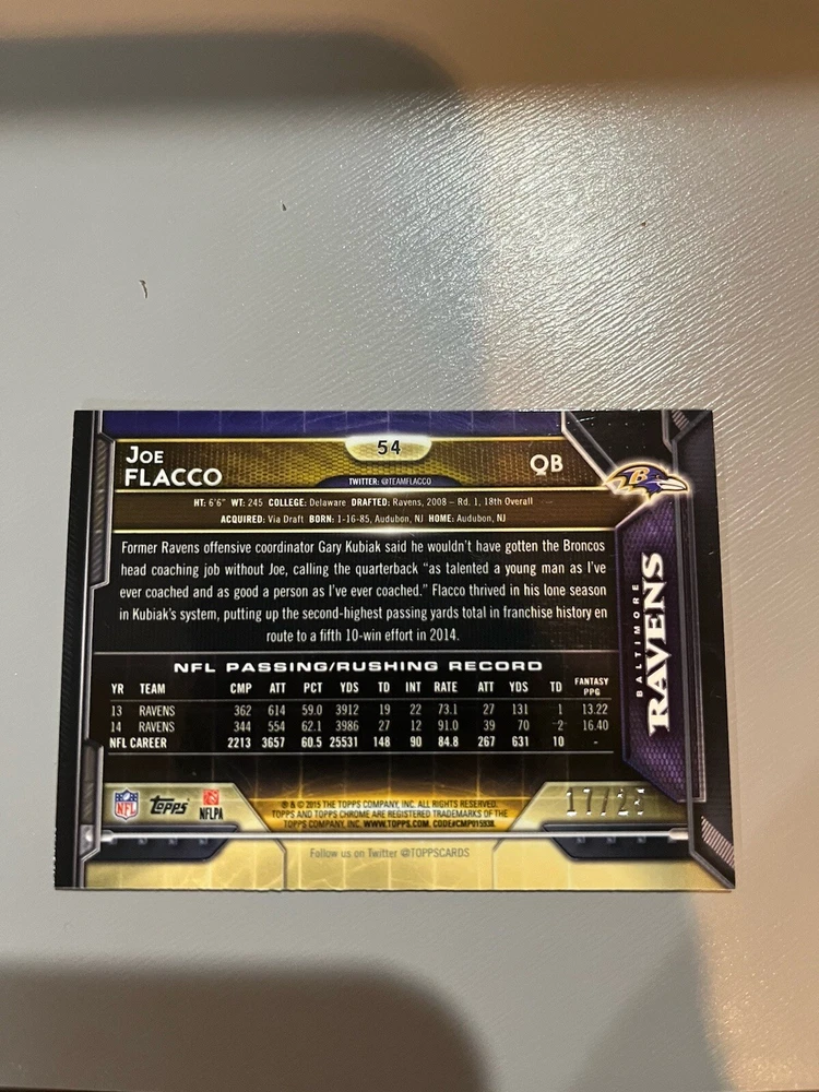 Really great looking rare pink refractor of Joe Flacco of the Baltimore Ravens. Nice card would be a great addition to any collection!